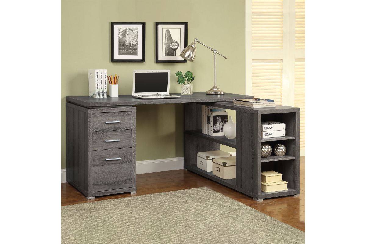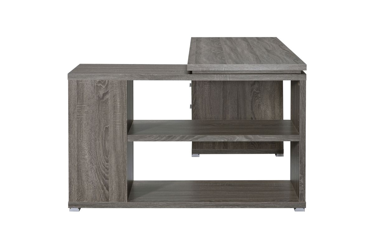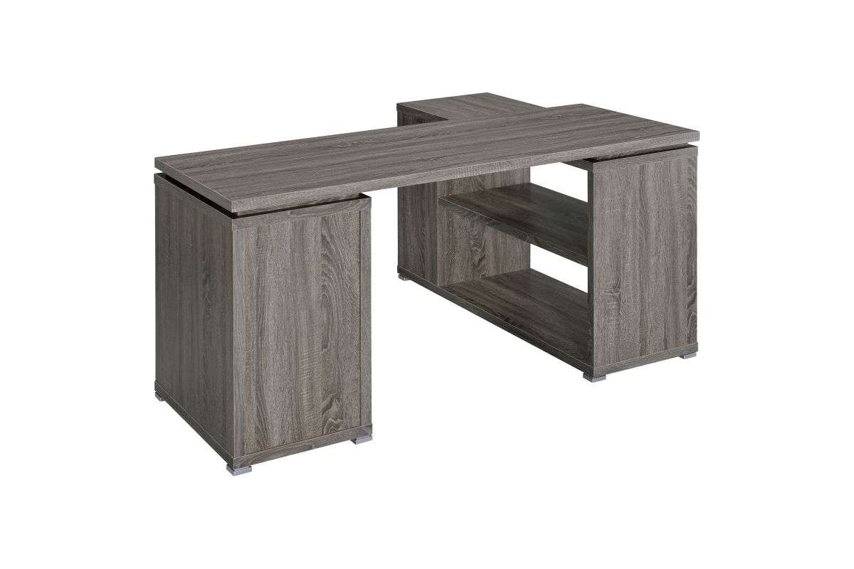 - L-shape office desk with articulating return in weathered grey finish