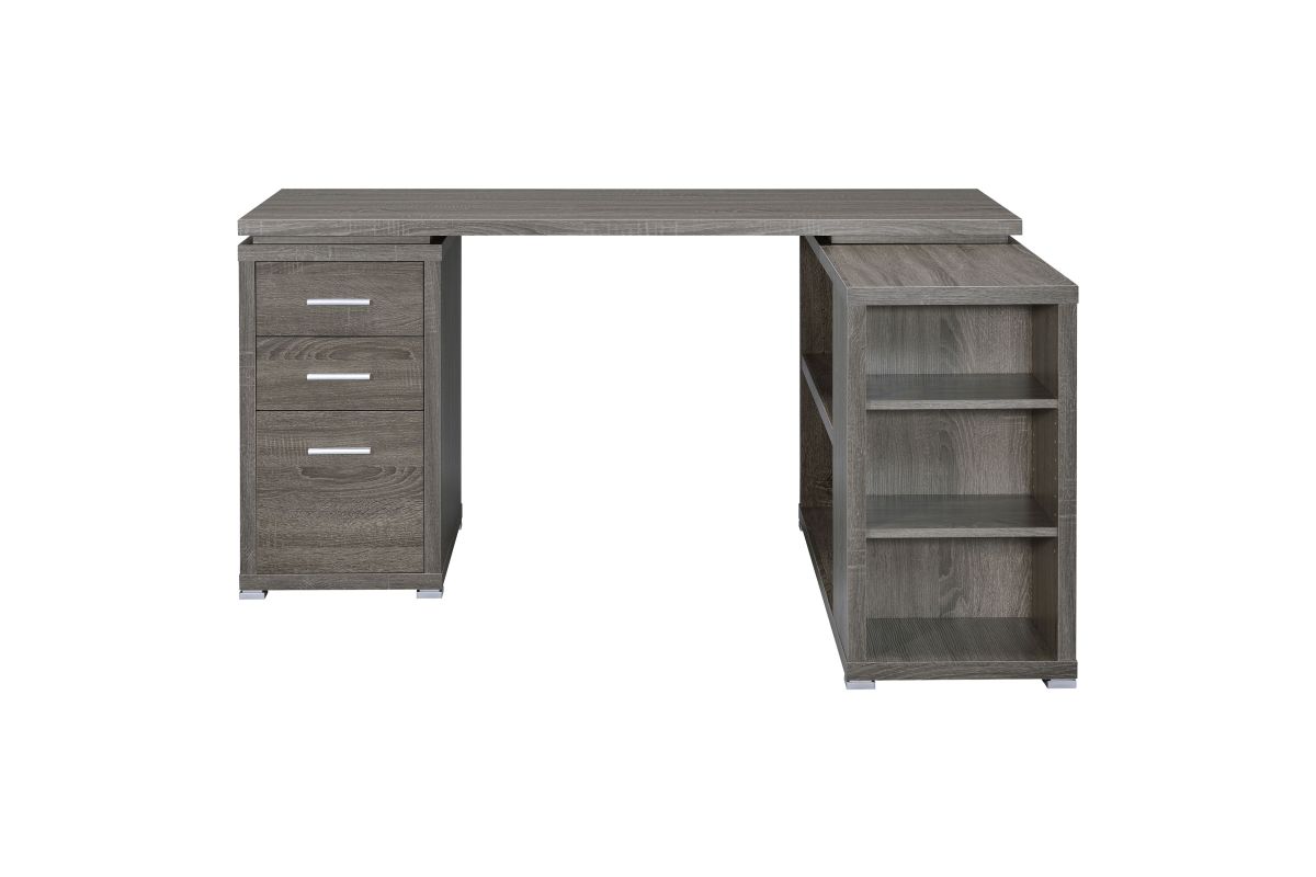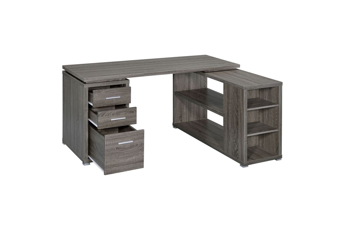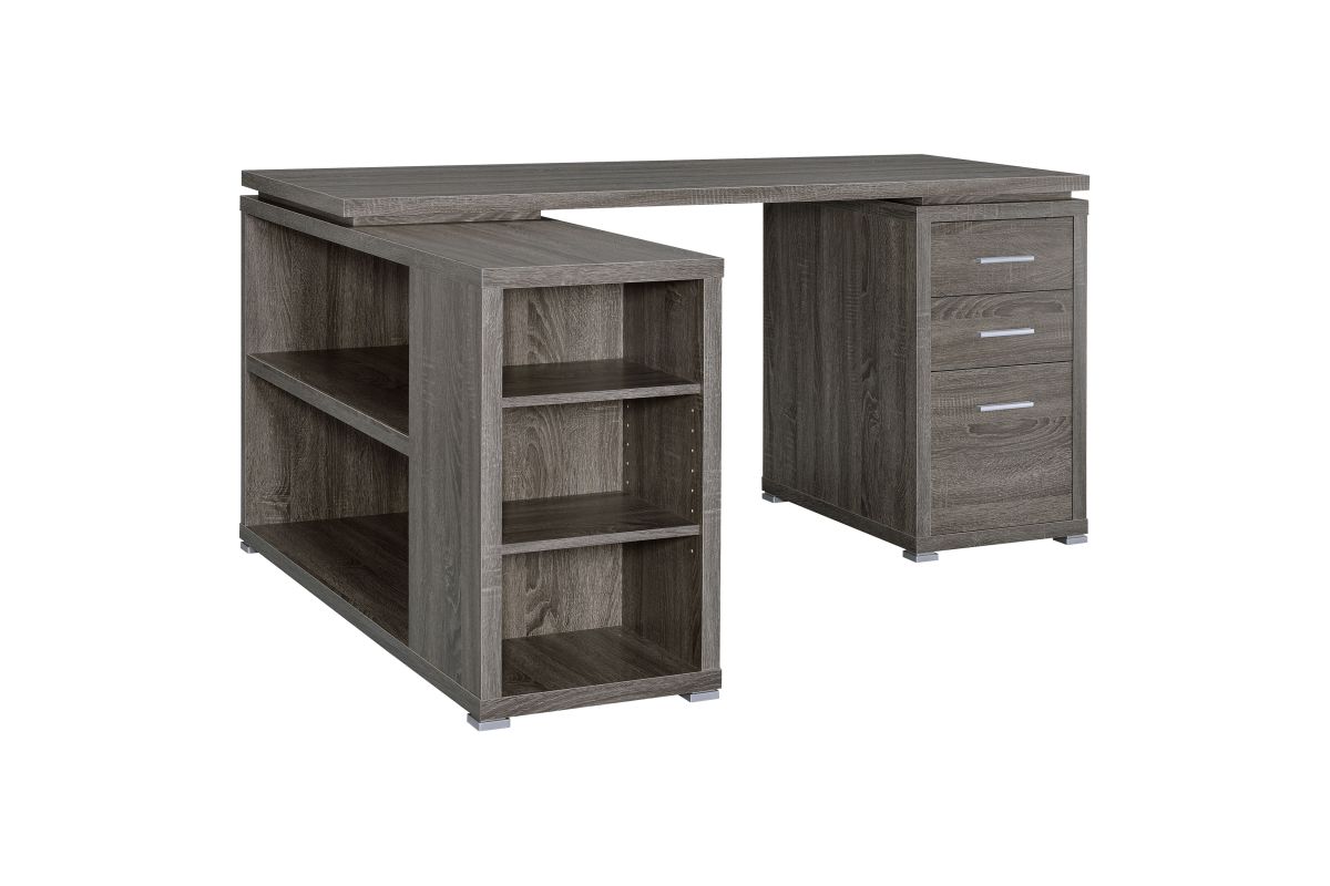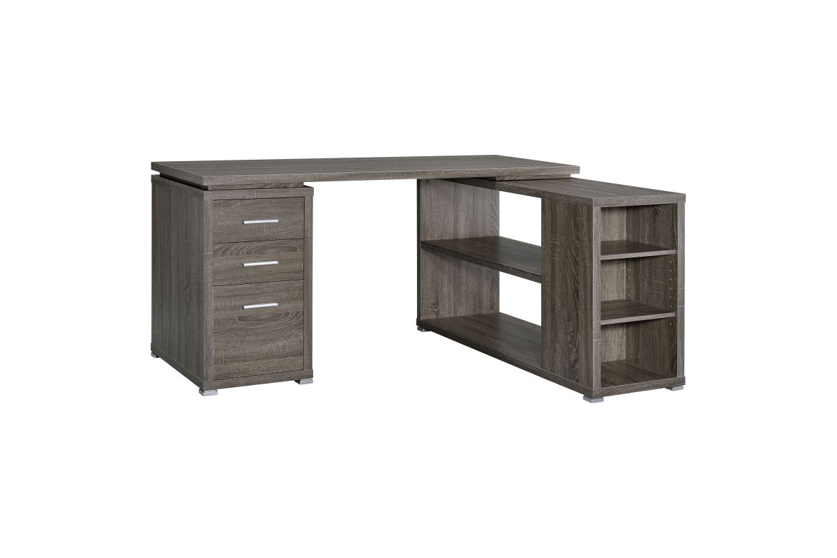 - L-shape office desk with articulating return in weathered grey finish