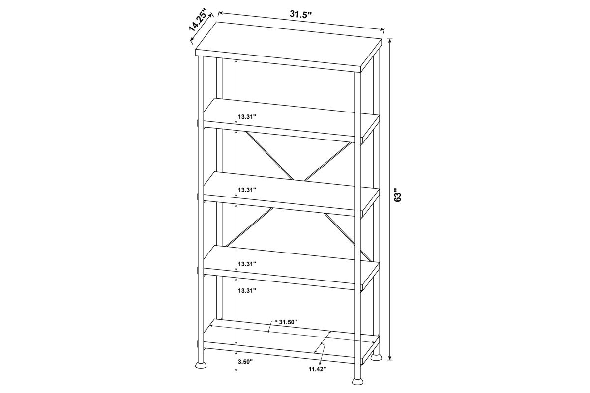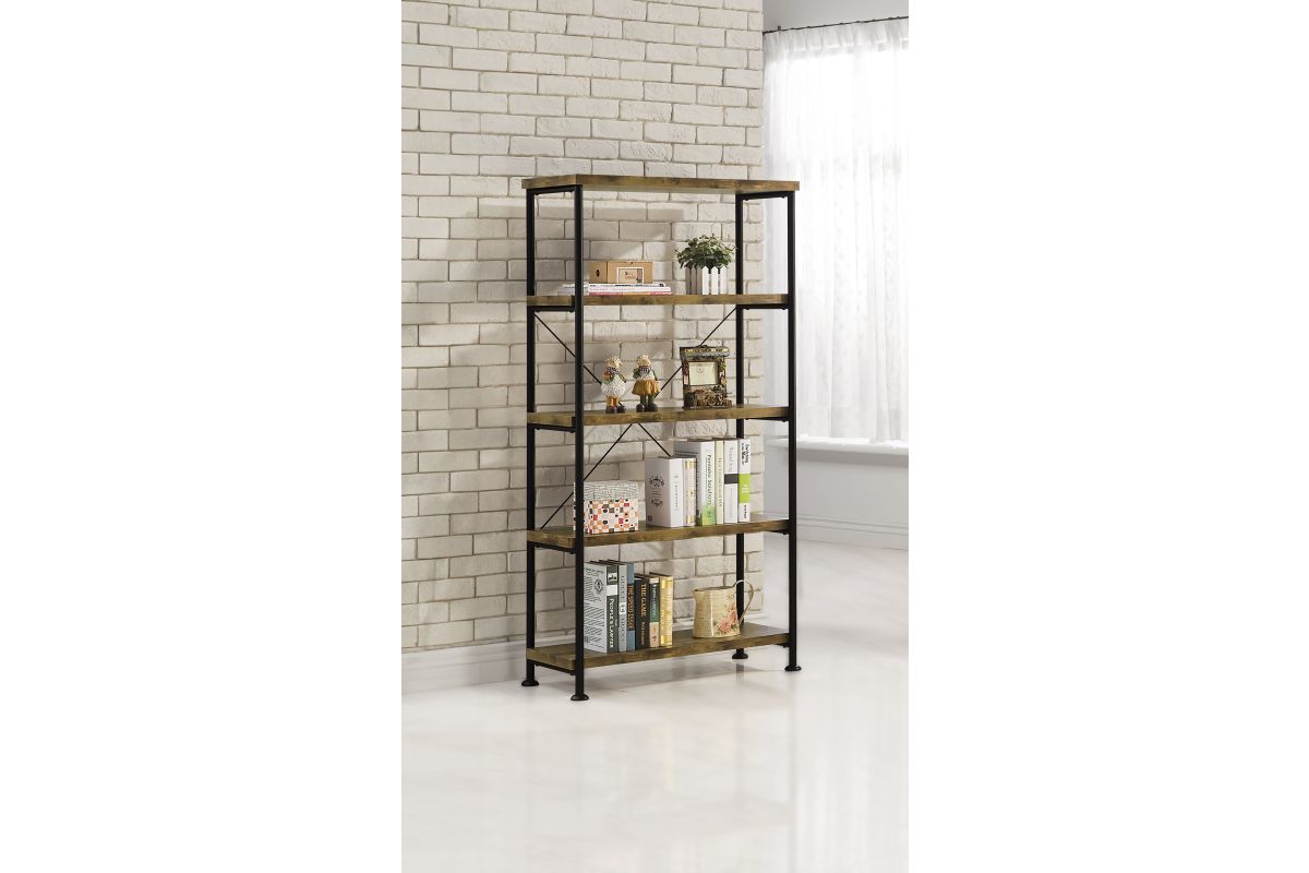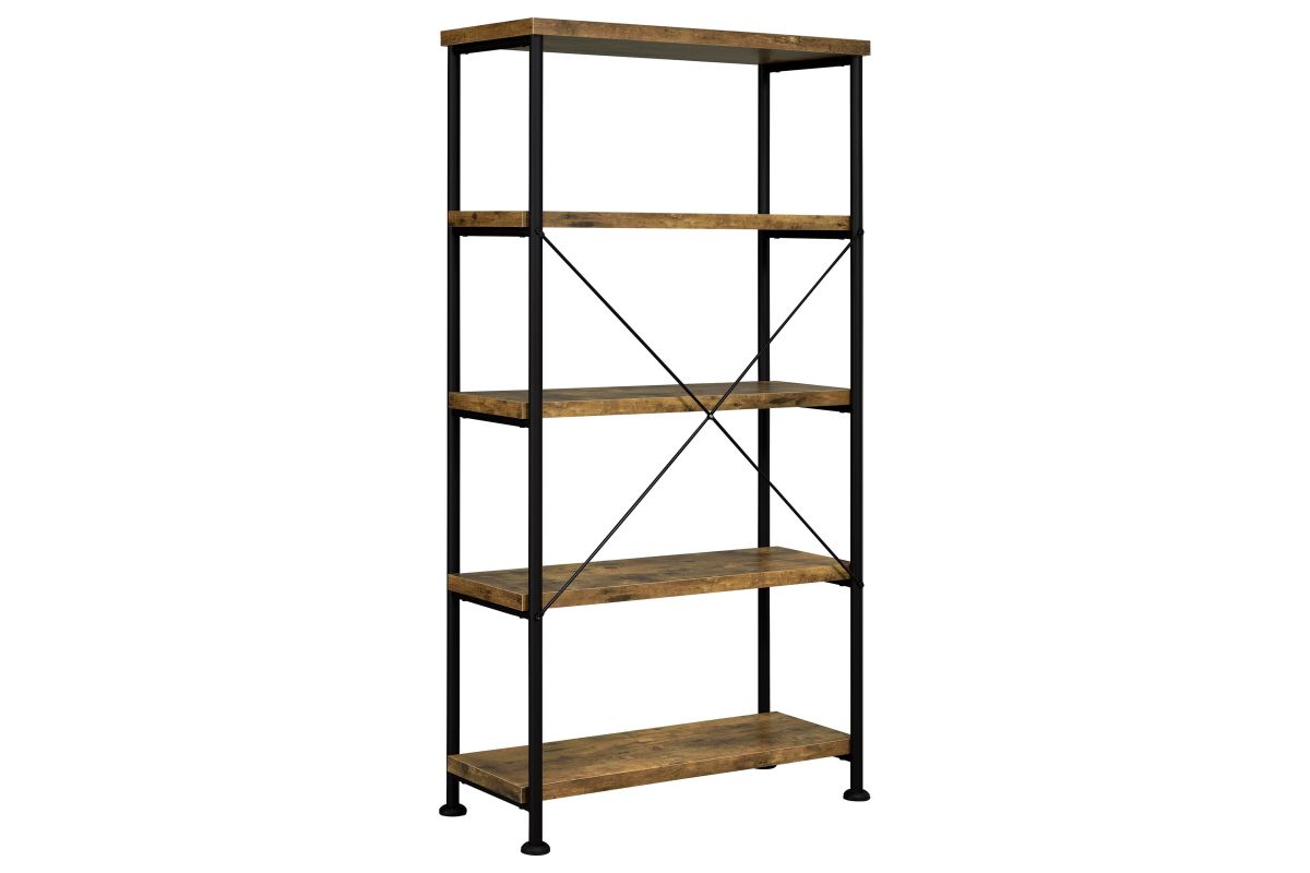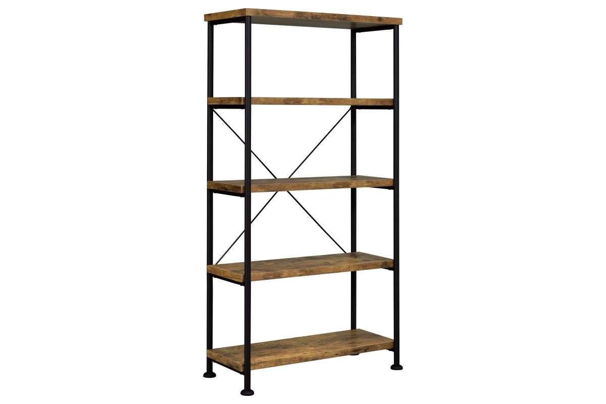 Keep important books handy with this eye-catching bookcase. Styled in an industrial motif, it blends antique nutmeg finish shelving with steel supports finished in black. Find plenty of space to store books and display accent decor. Place in a living room or family room as casual companion furniture. Four shelves and a top surface render this tall bookcase a perfect accent for an office or bedroom.