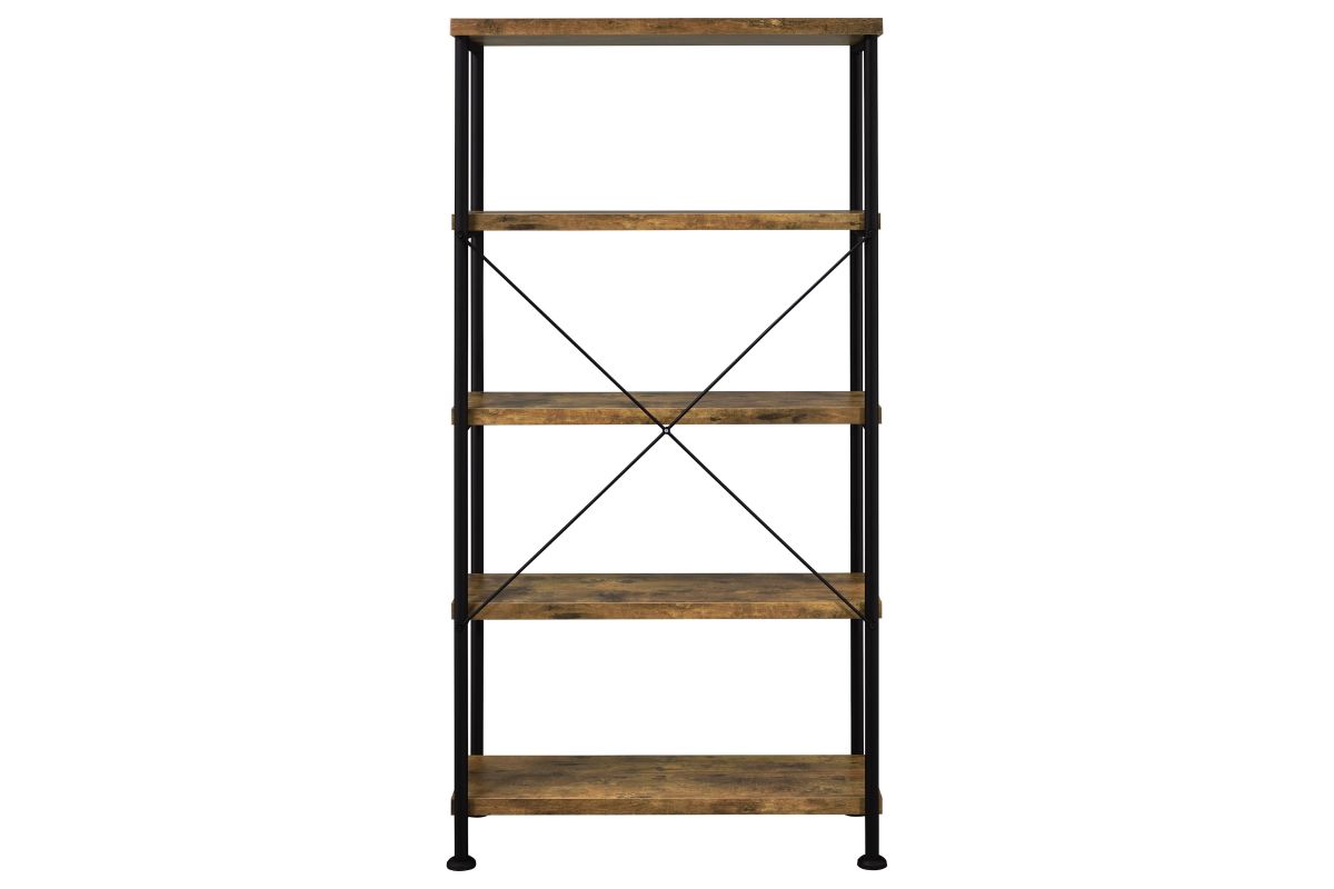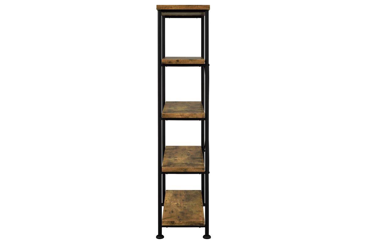 - Four-shelf bookcase with rustic nutmeg finish and open industrial styling