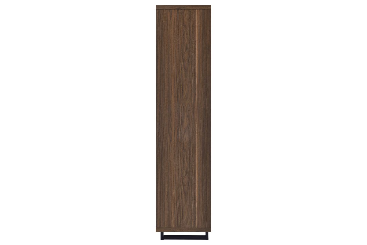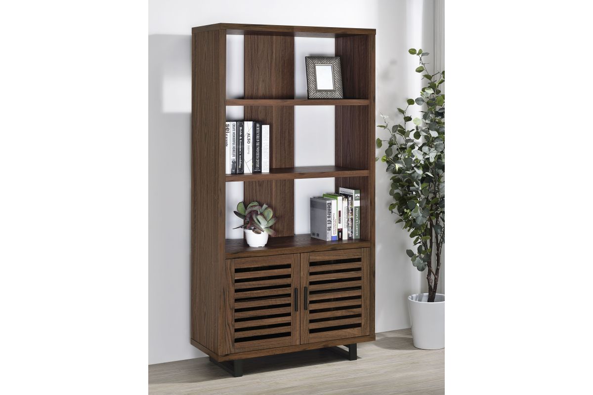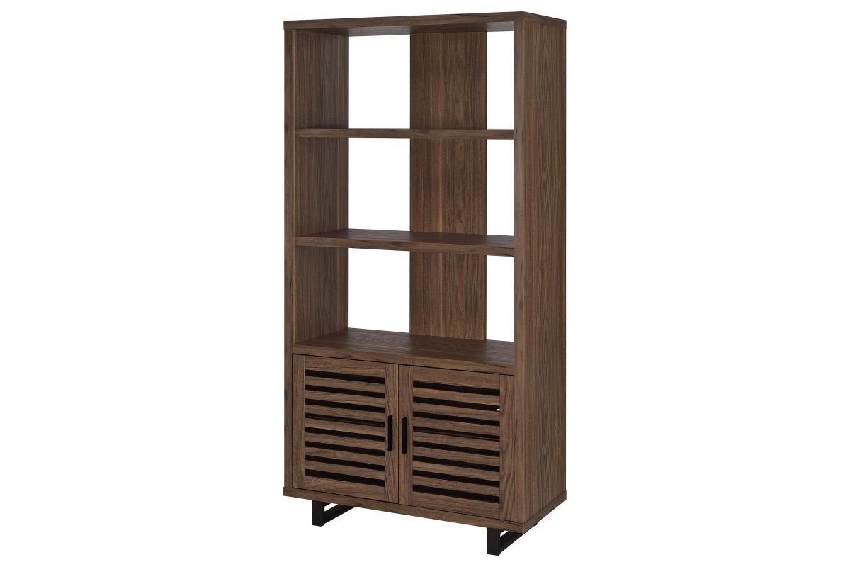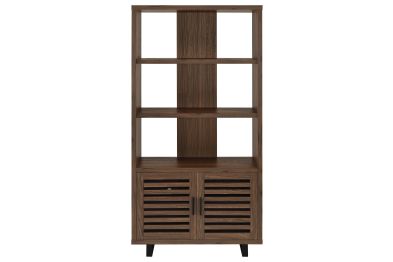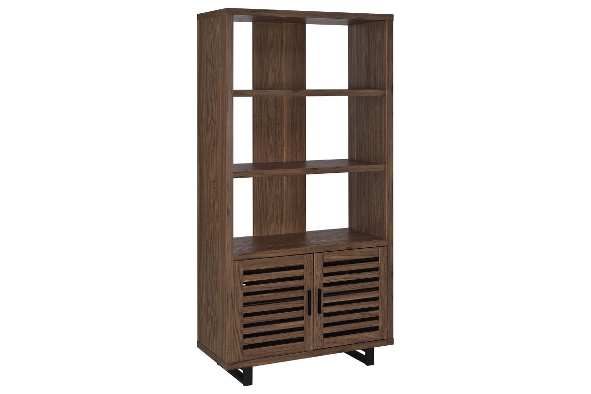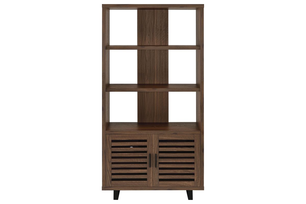 Create storage and add charm in one with a modern bookcase. It features a cabinet in the base, decorated with slatted doors that open to reveal shelving for easy storage. Upper shelves are open, with a center slat that creates dimension and offers structured support. The bookcase features a warm, rich walnut wood finish, easily lending in modern and mid-century inspired living spaces, bedrooms, and dens. The bookcase features a melamine finish that's durable and resistant to scratches and a tip-over restraint is included for added safety.