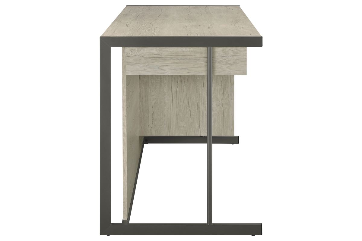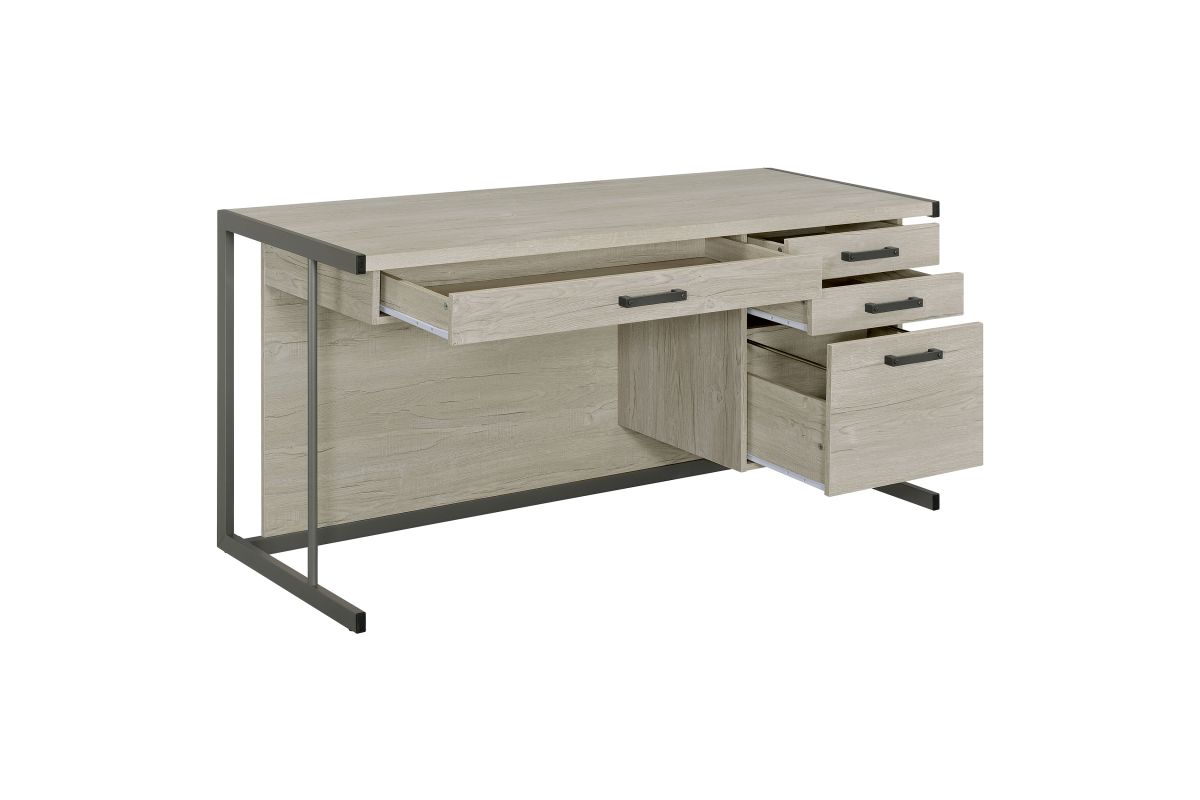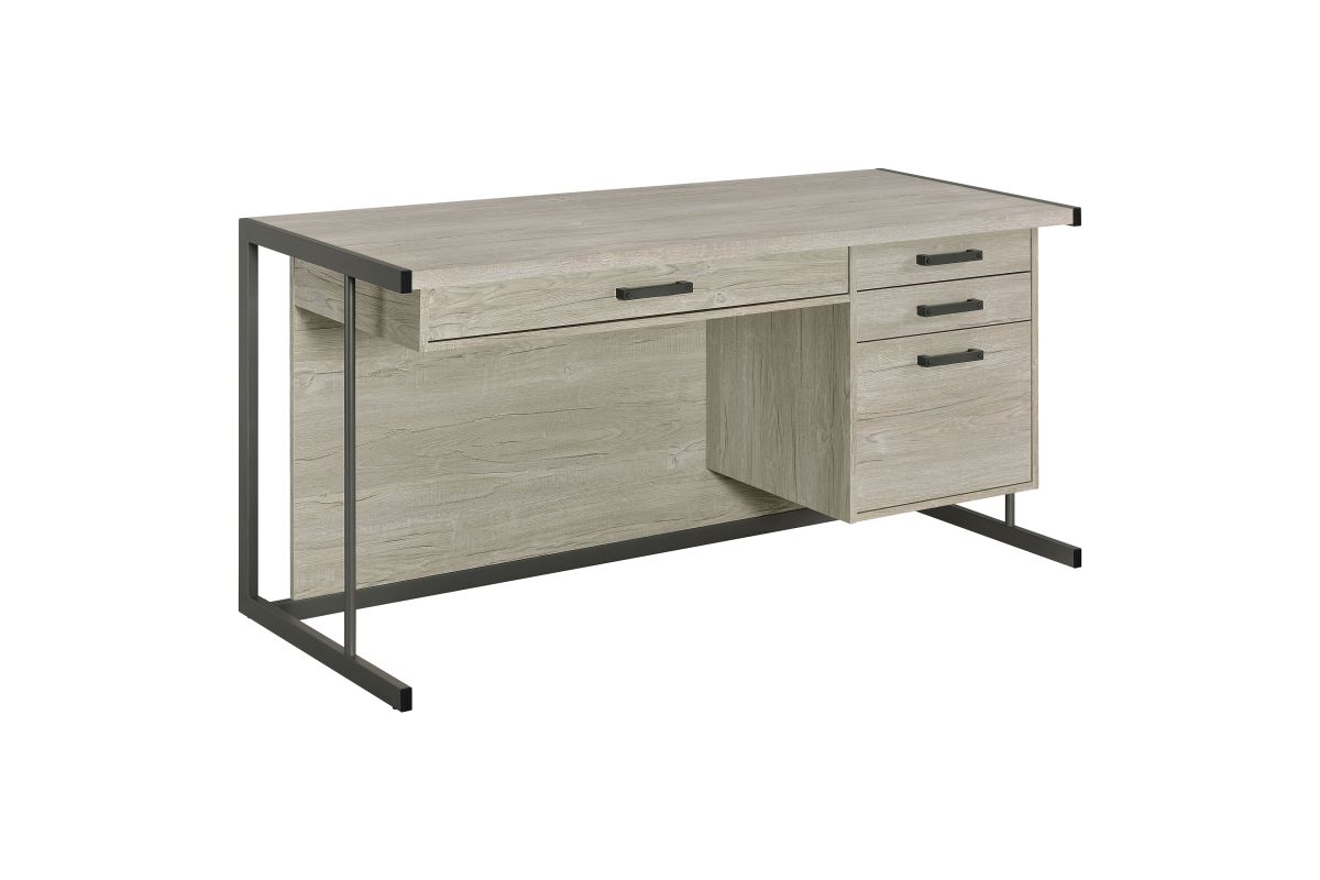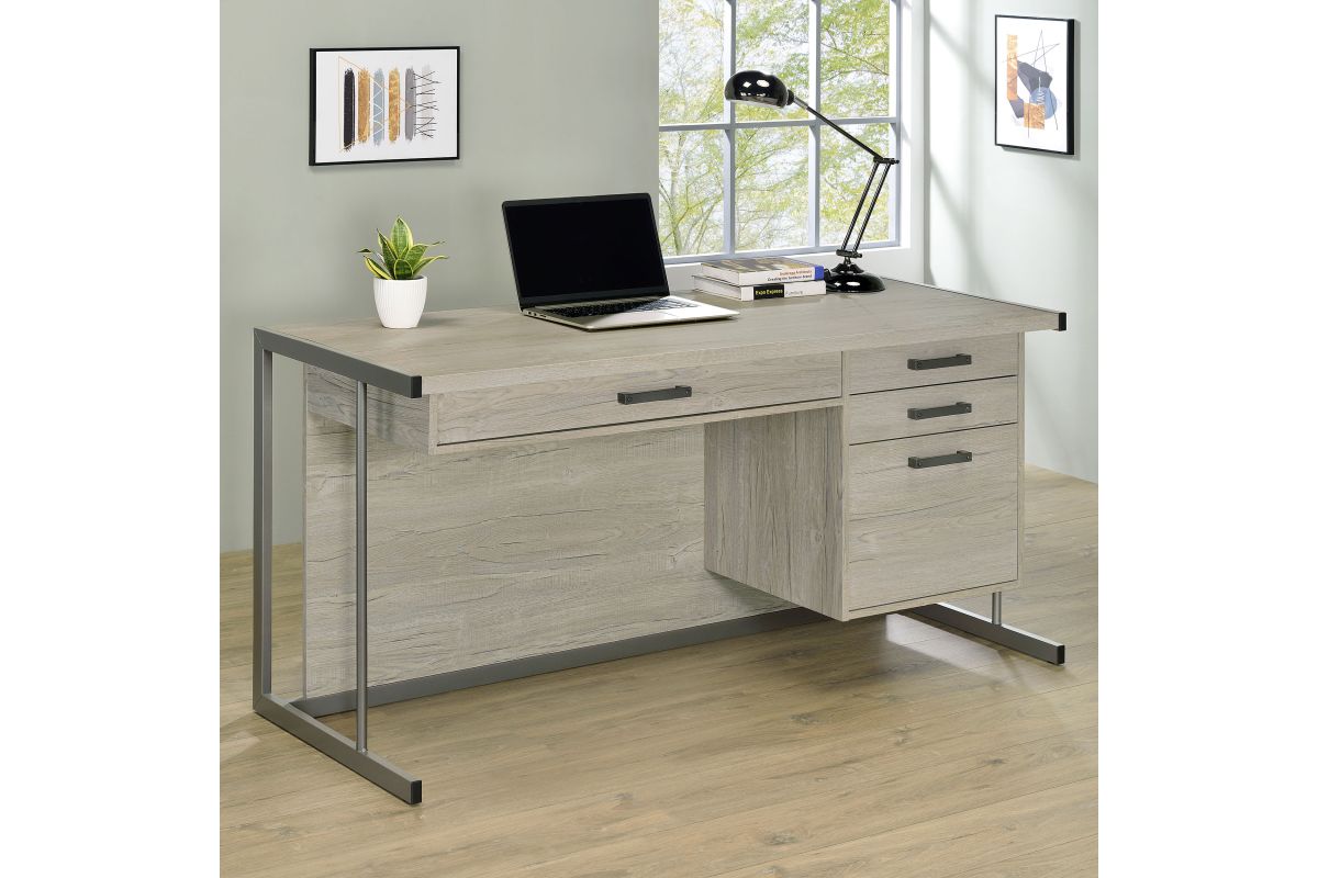 Elevate your contemporary home office and organize your supplies with this spacious contemporary office desk, featuring a light and bright whitewashed grey finish that maintains a clean look and feel to the space. Four drawers, including a deep file drawer, allow you to organize important documents, fastened with gunmetal finished pulls that coordinate with the grey finished sled style base.