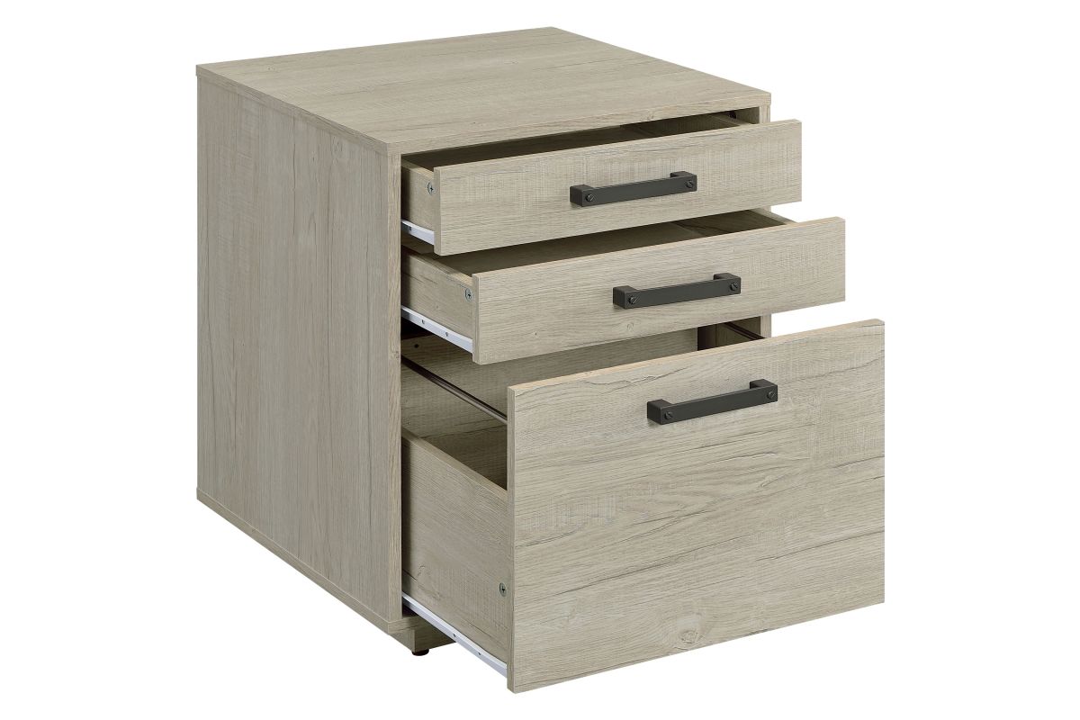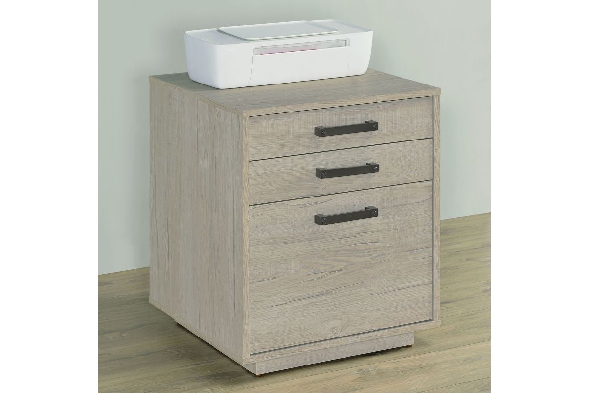 Streamline your workspace with this modern file cabinet, designed to enhance both form and function. The clean, box-style silhouette is finished in a soft whitewashed grey that brightens any office setting. Three spacious drawers provide organized storage for files, stationery, and office essentials. Sleek gunmetal bar pulls add an industrial touch, balancing the light tone with subtle contrast. Built from engineered wood and a durable laminate veneer, it offers strength and everyday practicality.