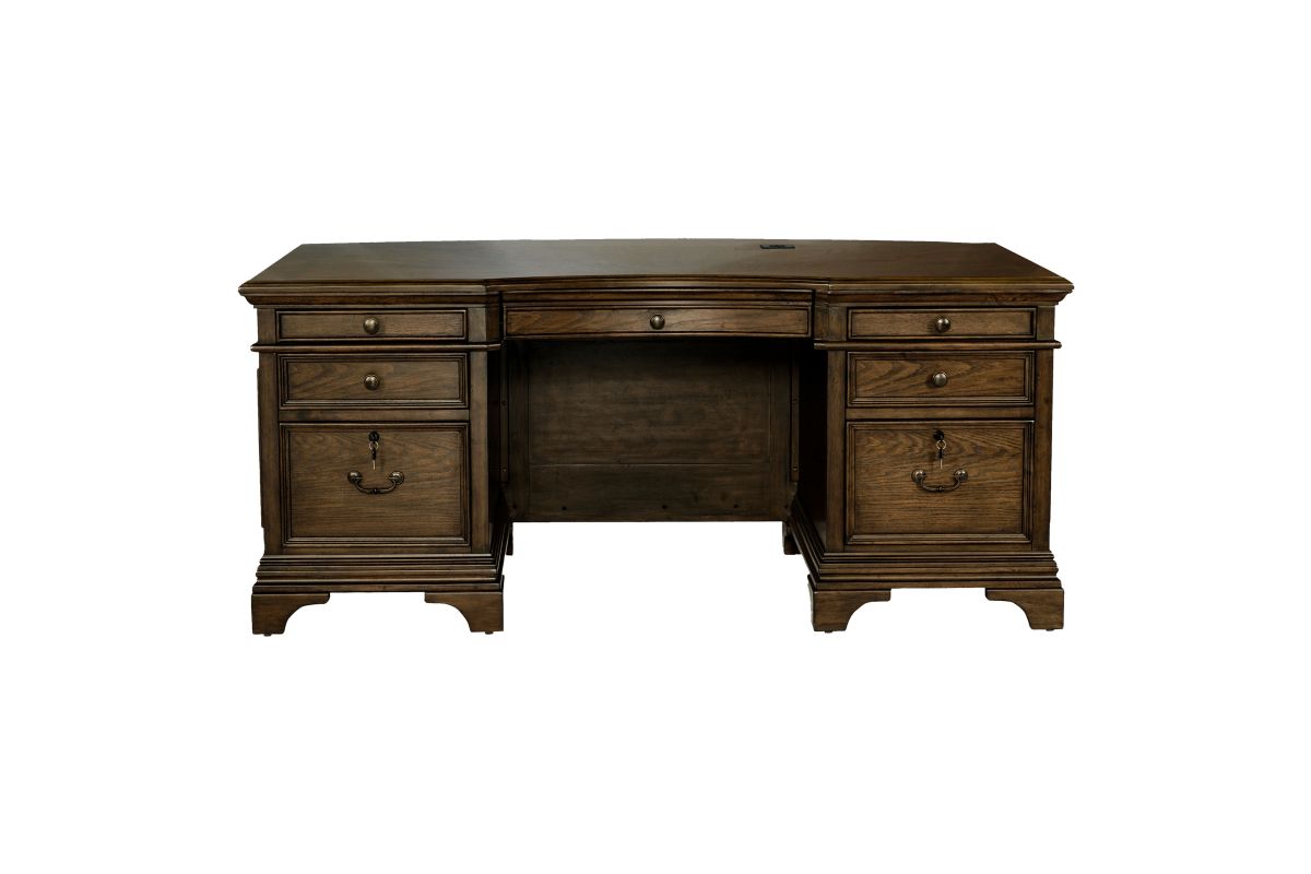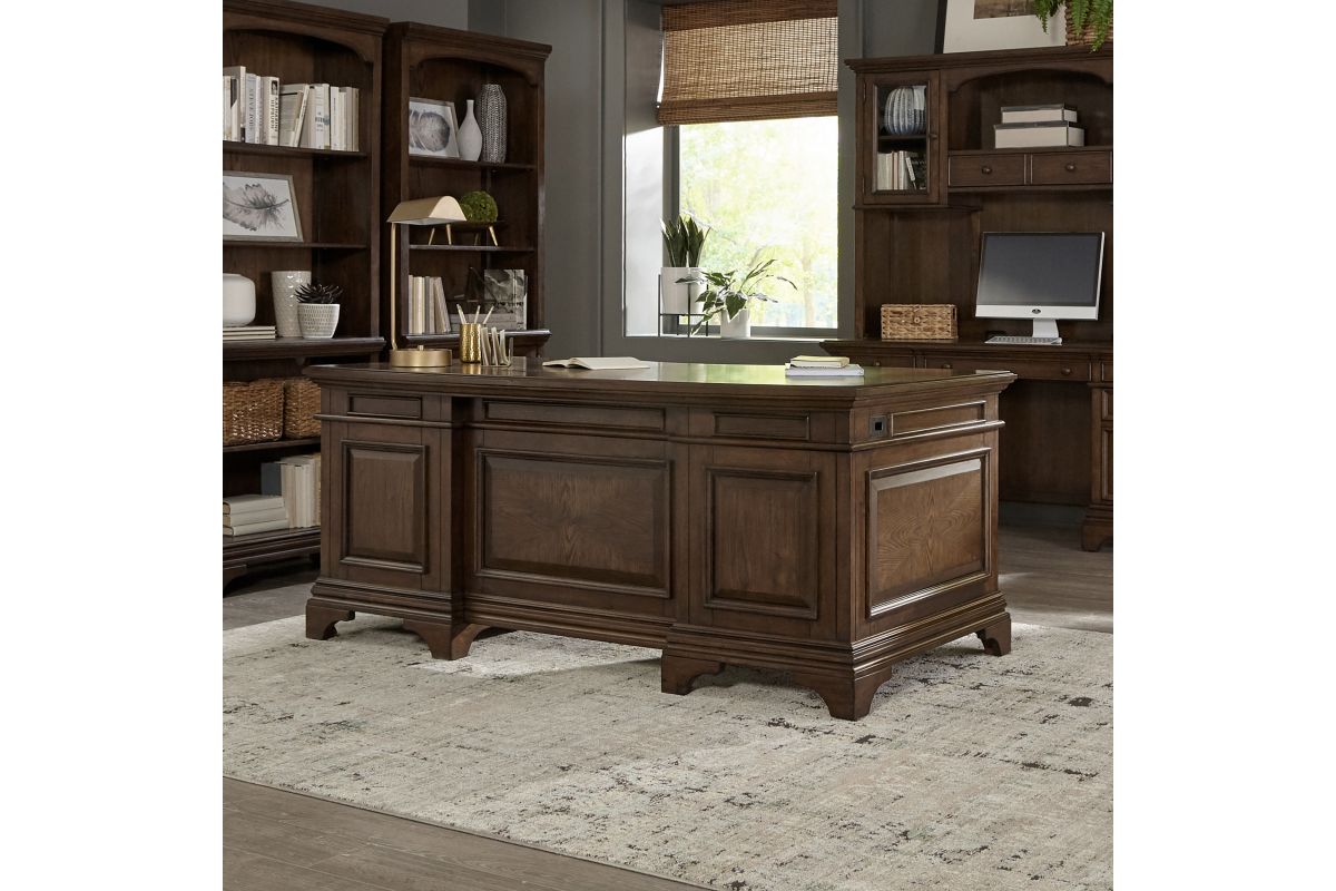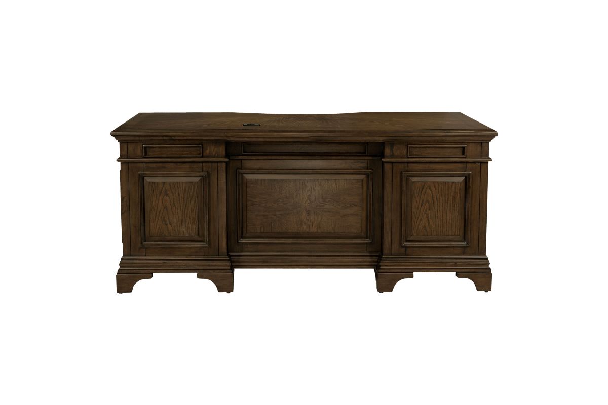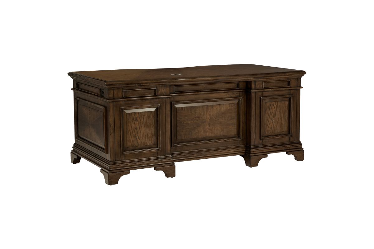- Executive desk in burnished oak with seven total storage drawers
