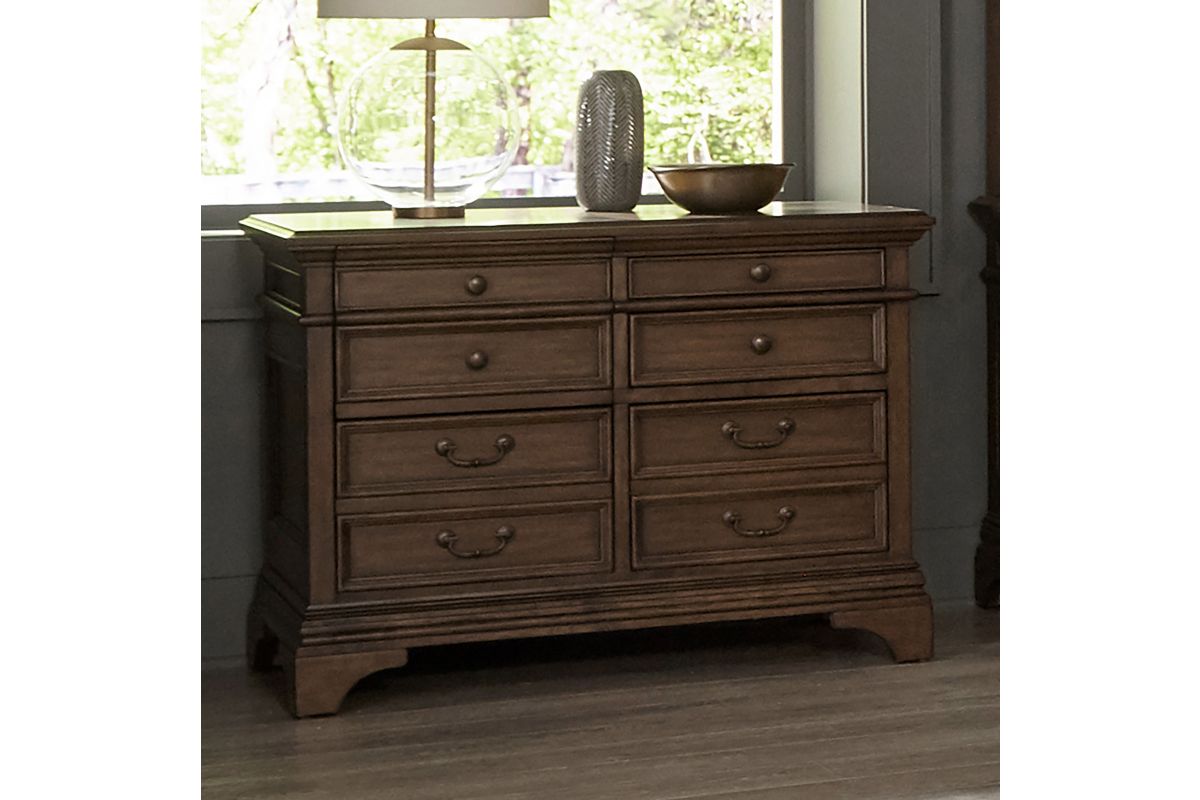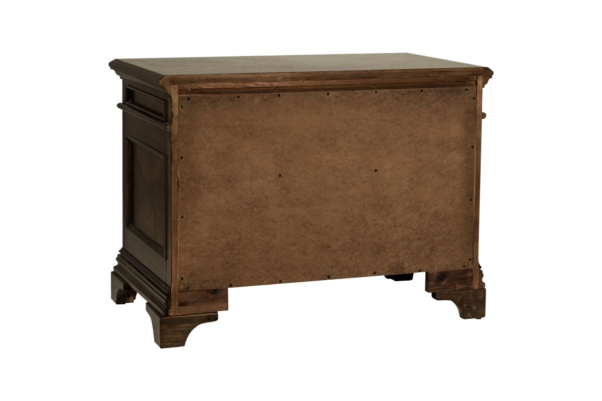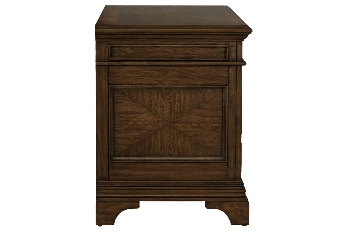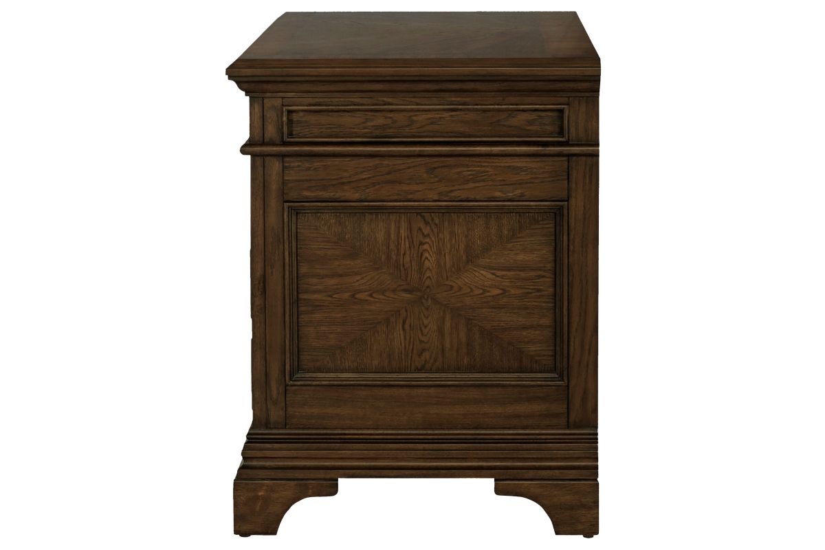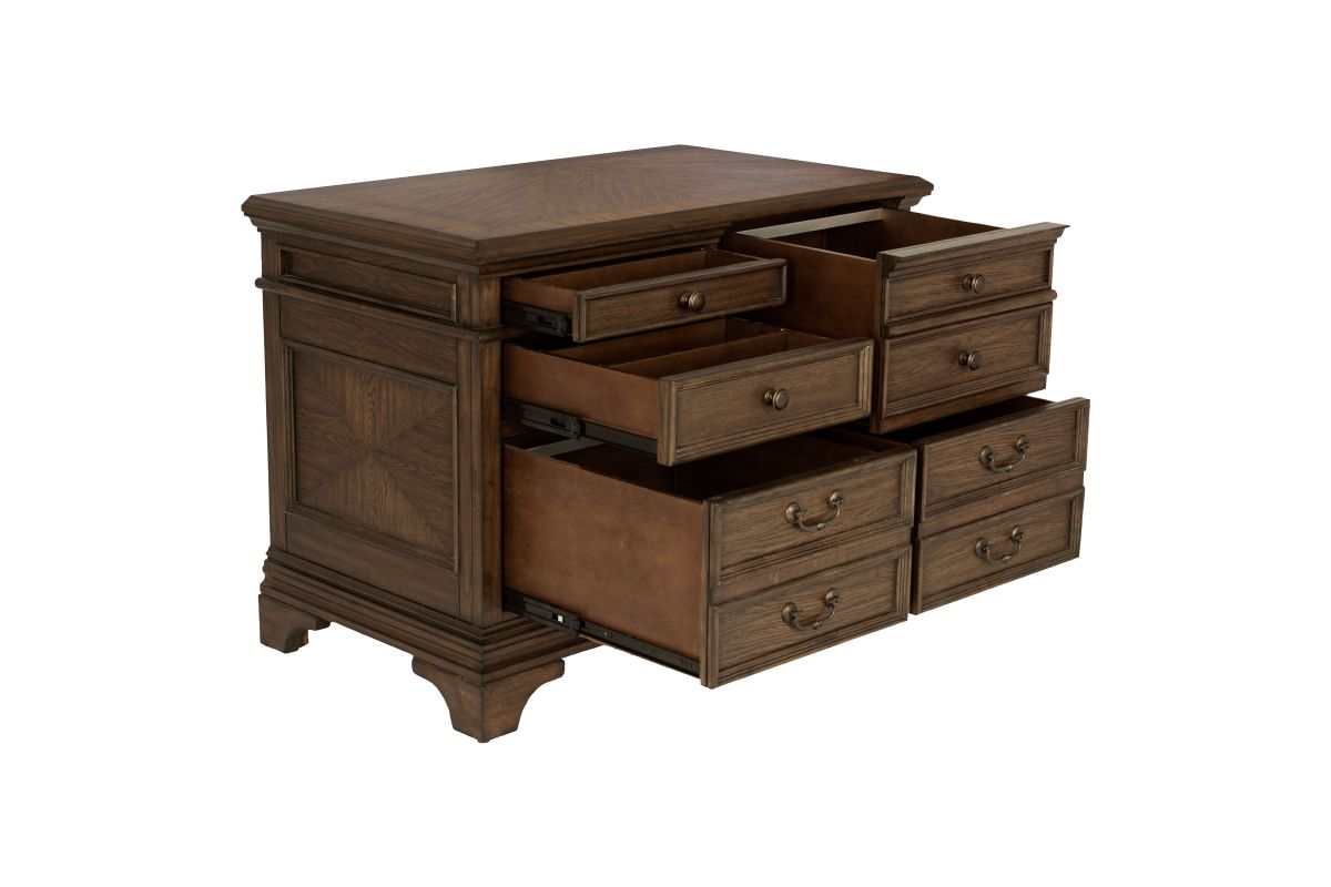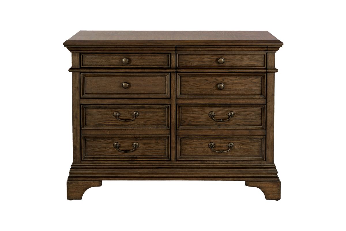 A stately upgrade for the traditional filing cabinet. This piece is crafted for classy office spaces. An expansive tabletop with molding accents offers an elegant option to place office items. Eight drawers flaunt round knobs and traditional style bar pulls. This piece is finished in burnished oak and supported on bracket style feet.