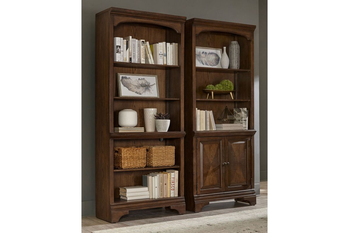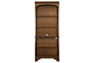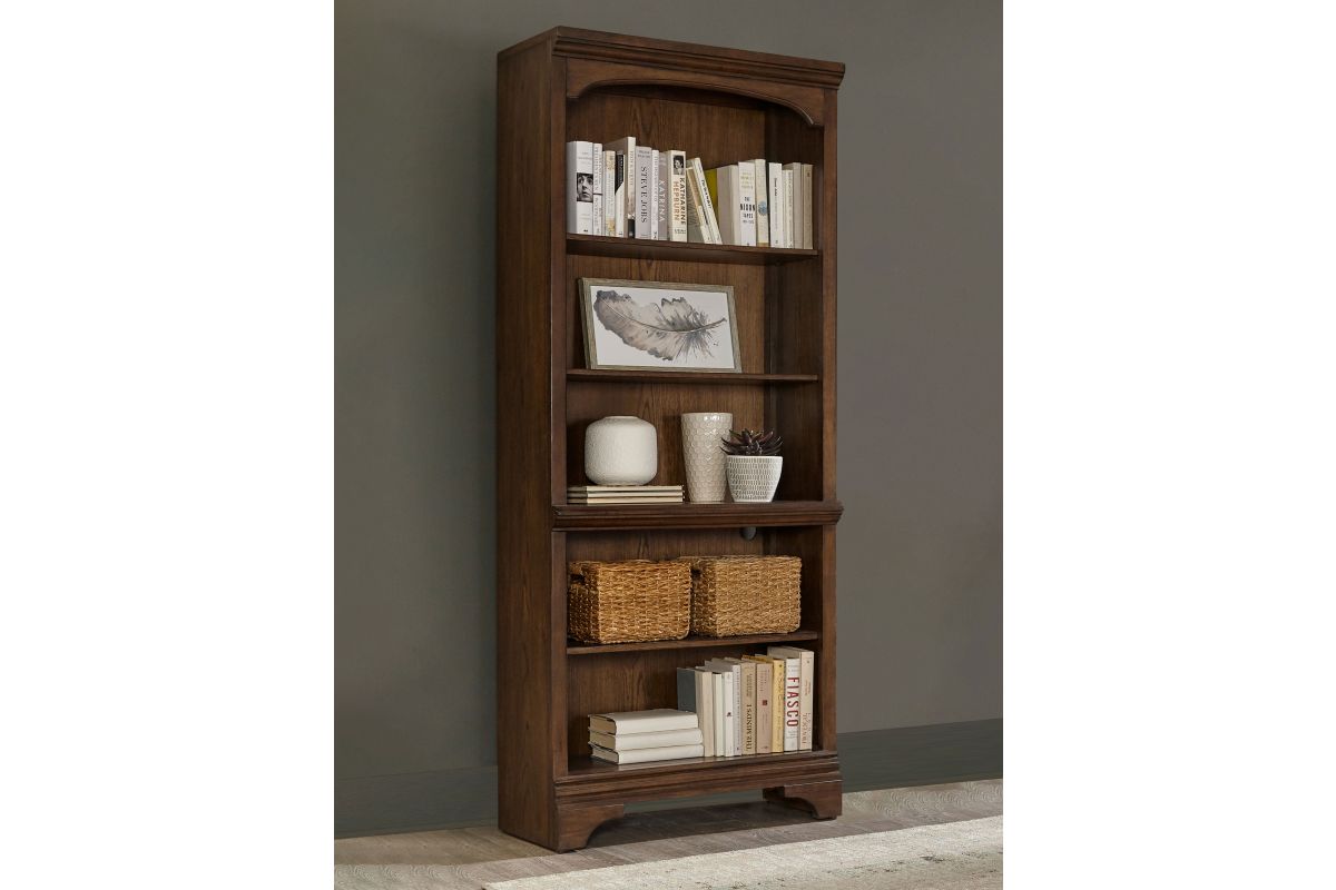 A traditional style bookcase is an elegant addition to offices and home libraries. This piece features five roomy shelves with plenty of space to arrange your favorite novels. Elegant detailing includes a stacked design on the top of the frame with a curved top. This piece is beautifully finished in burnished oak. It's supported on bracket style legs to bring stability.