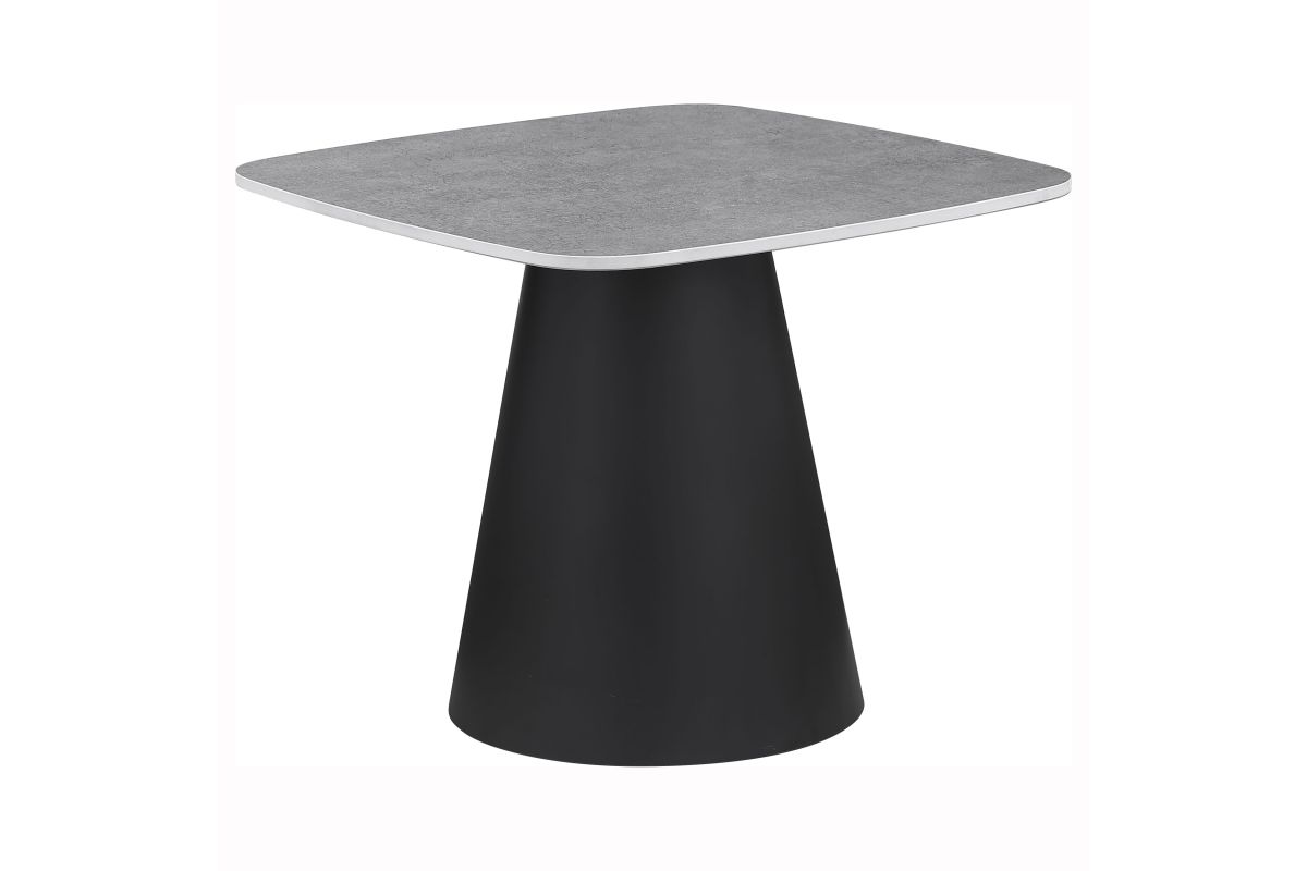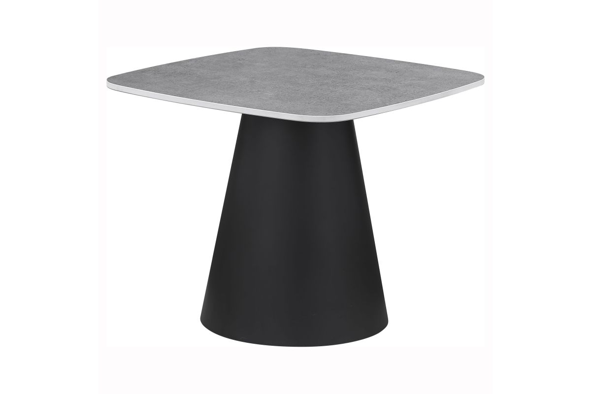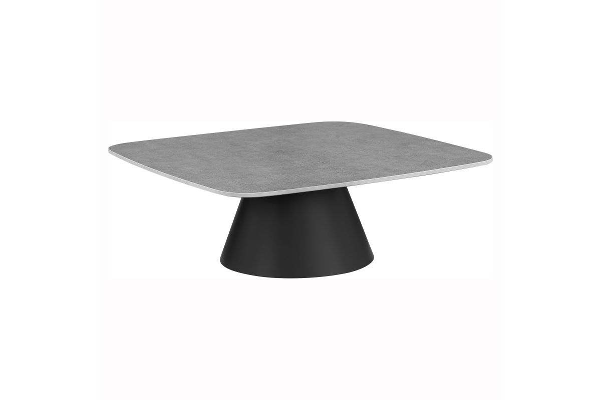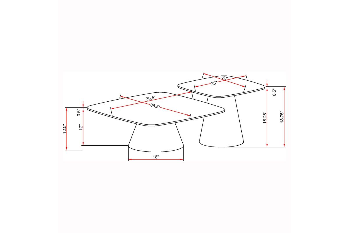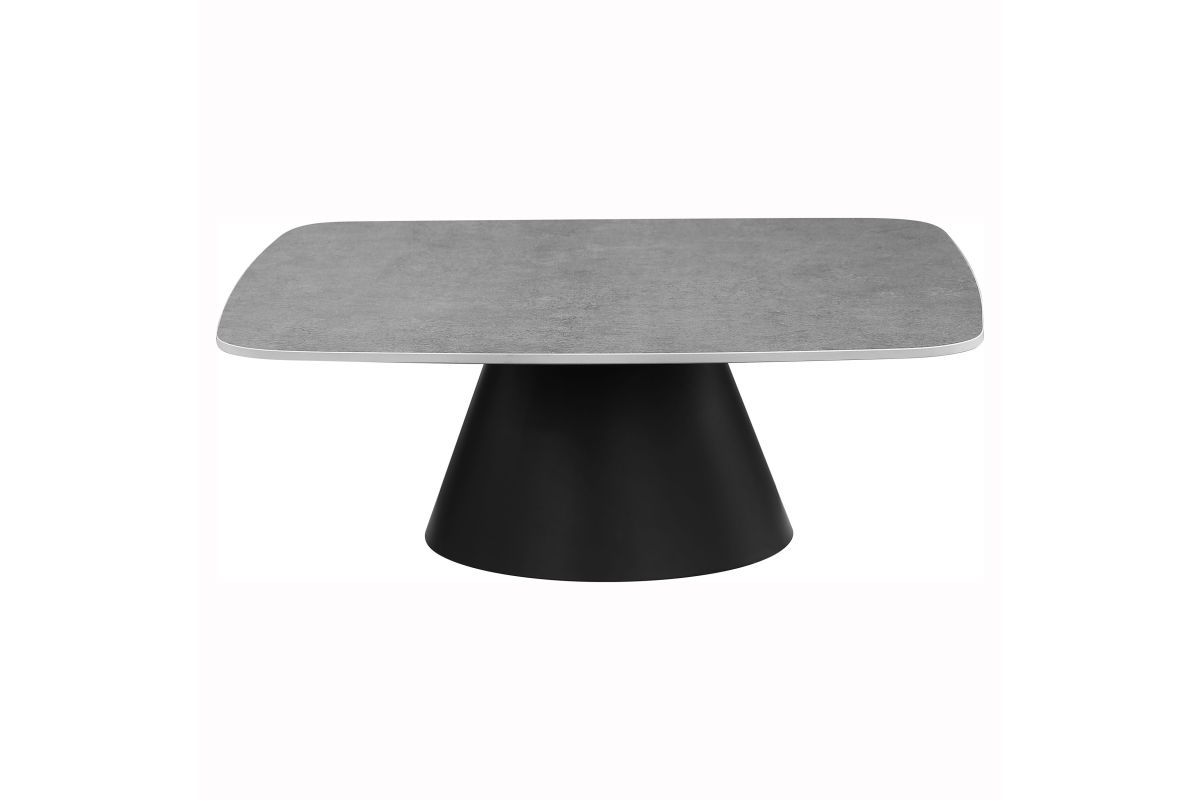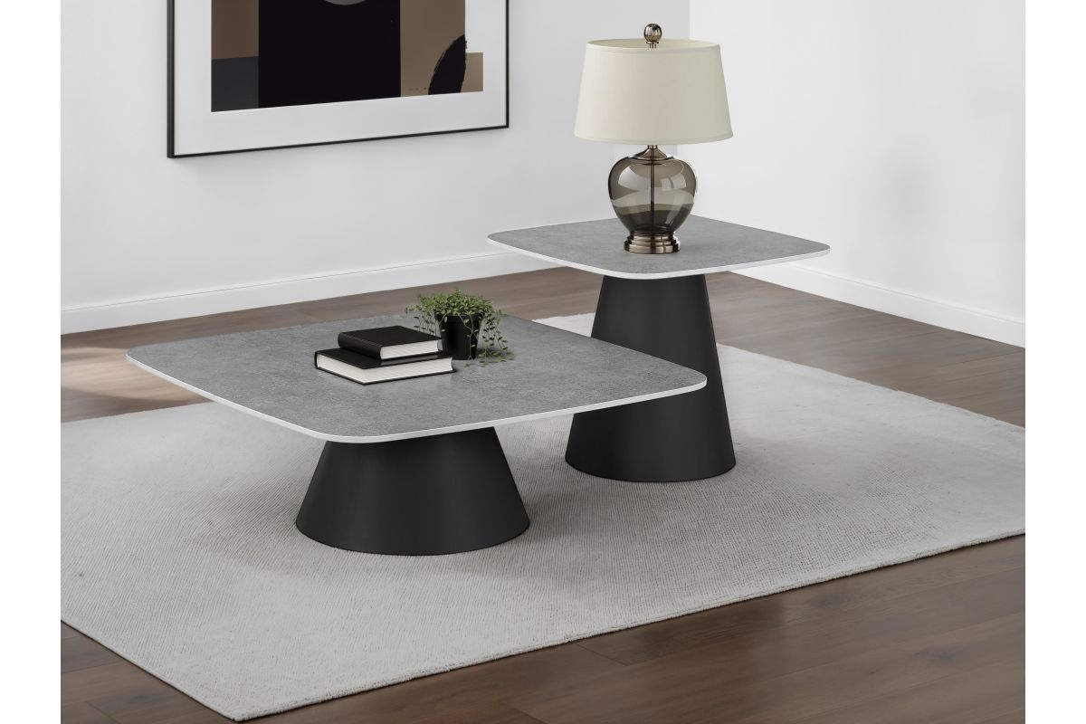 This two-piece coffee table set captures modern artistry through sculptural form and mixed materials. Each table features a square top with softly rounded corners in a concrete-look finish, perfectly balanced on matte black conical bases. The nesting design allows for flexible arrangement and compact storage. Constructed from durable engineered wood and sturdy metal, this cocktail table set makes a bold impression in any contemporary living space.