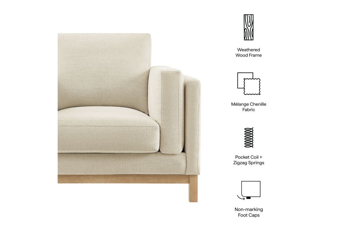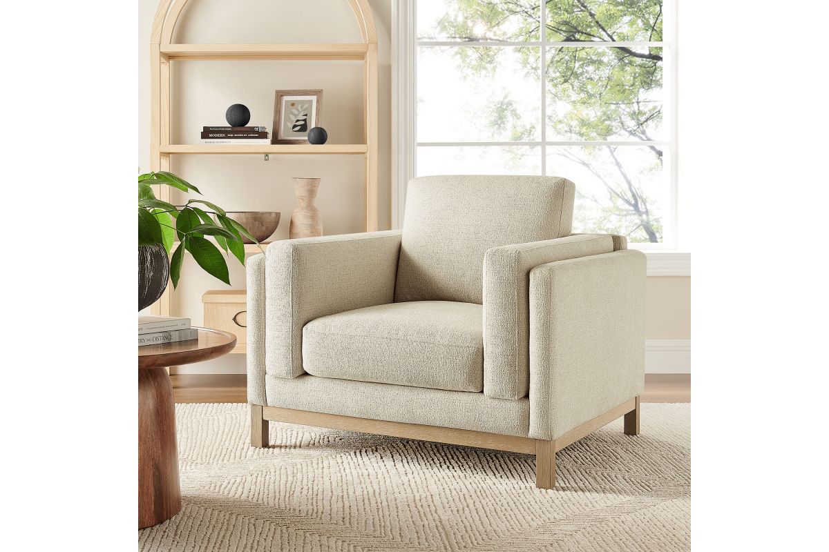 Refined lines and enduring design shape the Roscoe Armchair, a tailored take on American-traditional style. Upholstered in soft and subtle Mélange Chenille fabric, this accent chair with arms features a deep, wide seat with plush back and seat cushions, made of high resiliency foam, further supported by spring pocket coils and sinuous springs for lasting comfort. The low, streamlined profile sits atop a kiln-dried weathered wood frame with integrated legs and non-marking foot caps for added stability and floor protection. A versatile comfortable accent chair for modern or classic interiors, Roscoe is great as a lounge chair for bedroom, corner reading chair, or living room accent chair. Weight Capacity: 800 lbs.