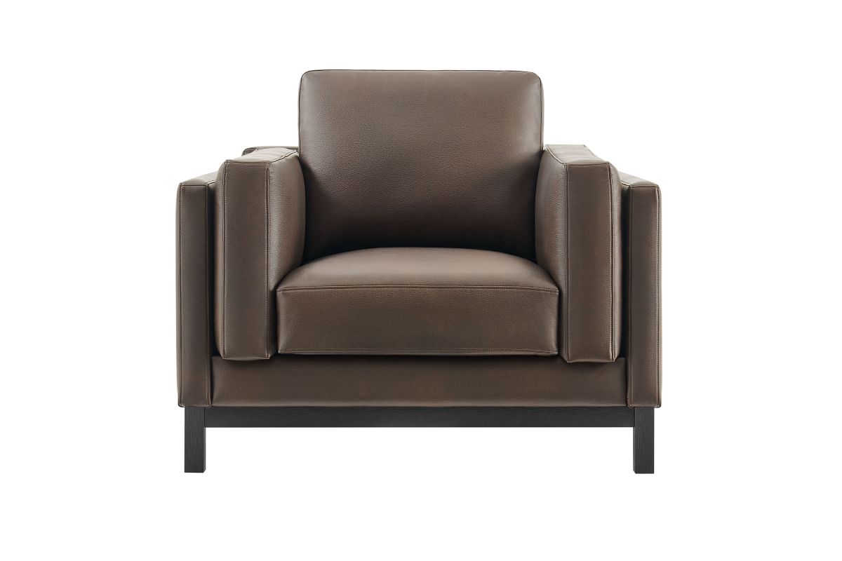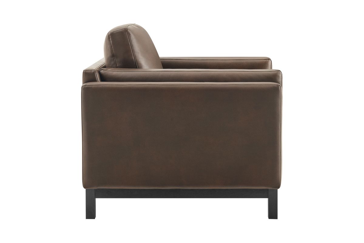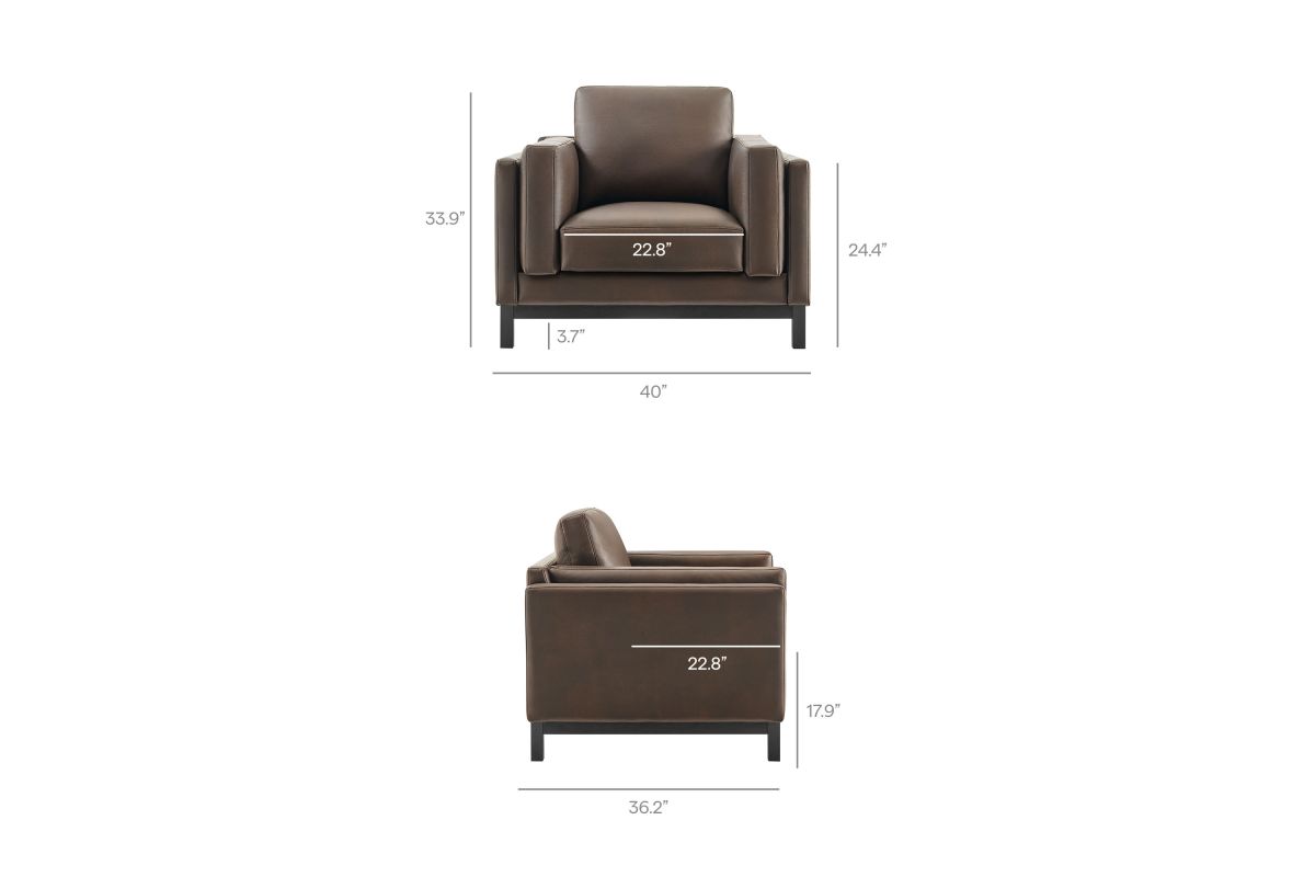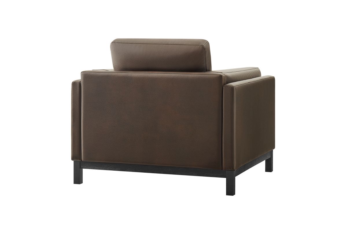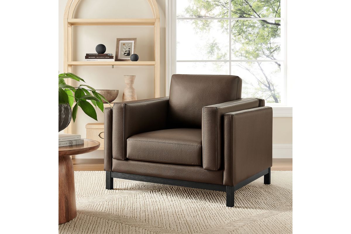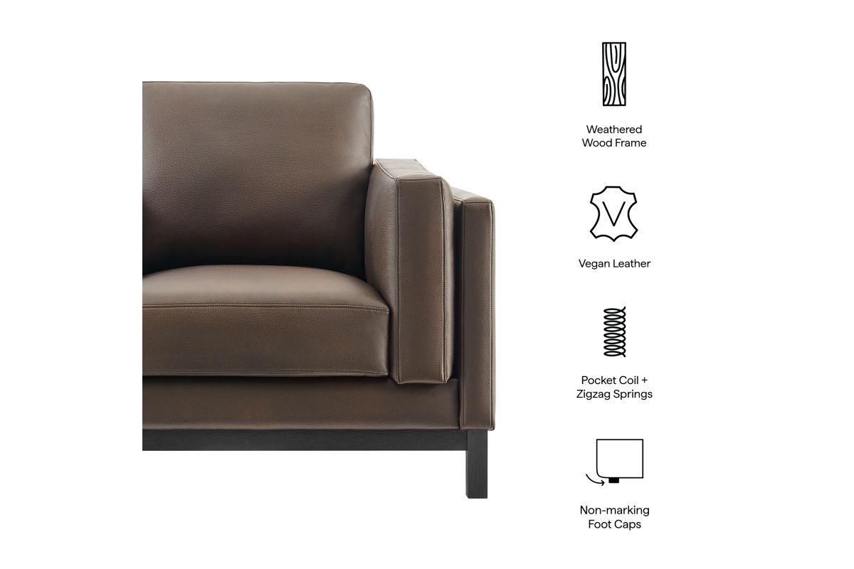 Refined lines and enduring design shape the Roscoe Armchair, a tailored take on American-traditional style. Upholstered in smooth vegan leather, this accent chair with arms features a deep, wide seat with plush back and seat cushions, made of high resiliency foam, further supported by spring pocket coils and sinuous springs for lasting comfort. The low, streamlined profile sits atop a kiln-dried weathered wood frame with integrated legs and non-marking foot caps for added stability and floor protection. A versatile faux leather accent chair for modern or classic interiors, Roscoe is great as a lounge chair for bedroom, corner reading chair, or living room leather chair. Weight Capacity: 800 lbs.