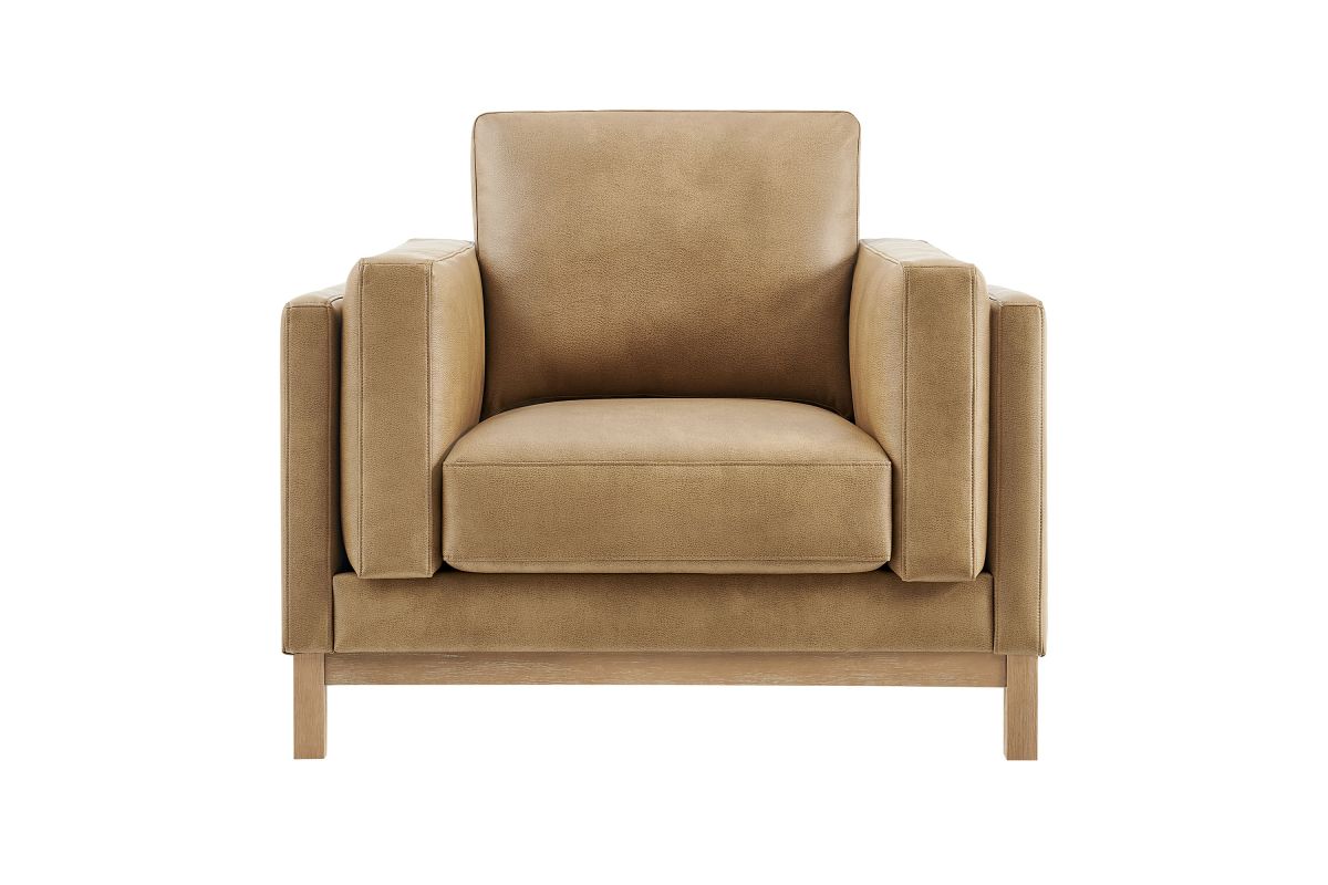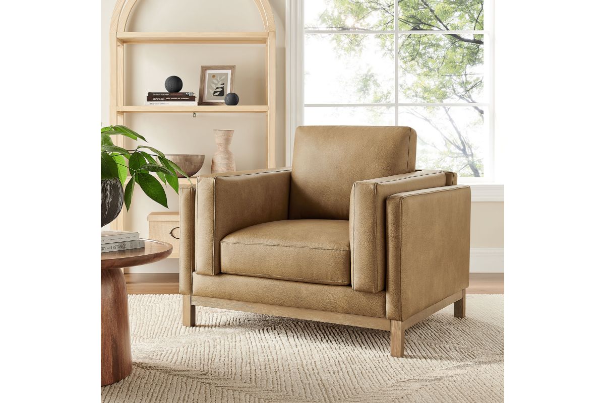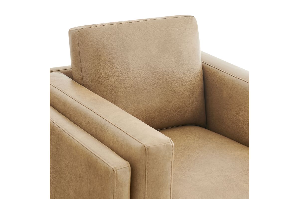 Refined lines and enduring design shape the Roscoe Armchair, a tailored take on American-traditional style. Upholstered in smooth vegan leather, this accent chair with arms features a deep, wide seat with plush back and seat cushions, made of high resiliency foam, further supported by spring pocket coils and sinuous springs for lasting comfort. The low, streamlined profile sits atop a kiln-dried weathered wood frame with integrated legs and non-marking foot caps for added stability and floor protection. A versatile faux leather accent chair for modern or classic interiors, Roscoe is great as a lounge chair for bedroom, corner reading chair, or living room leather chair. Weight Capacity: 800 lbs.