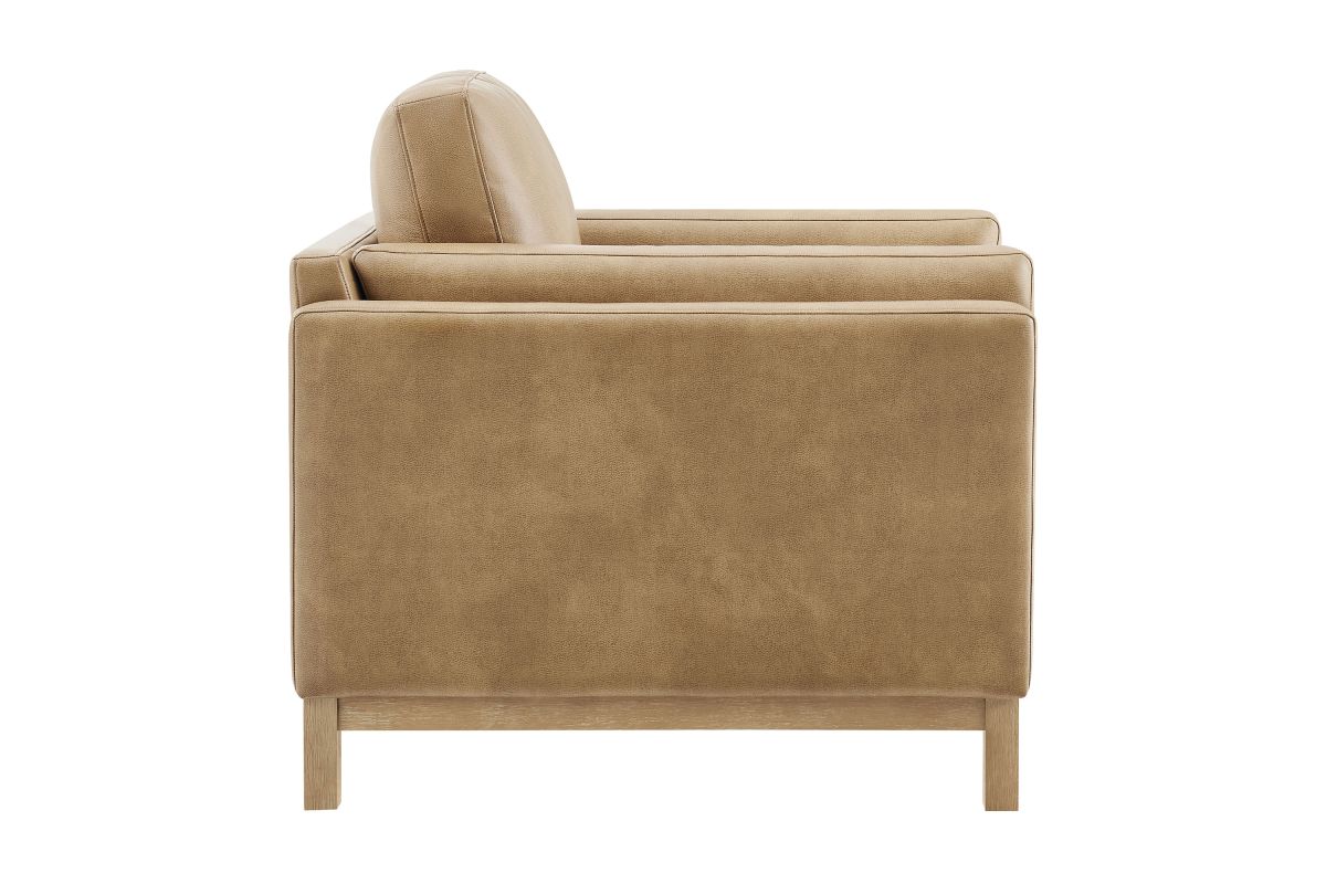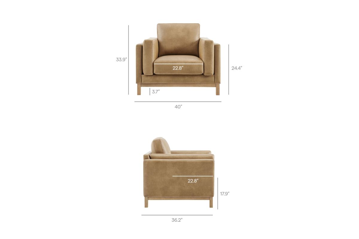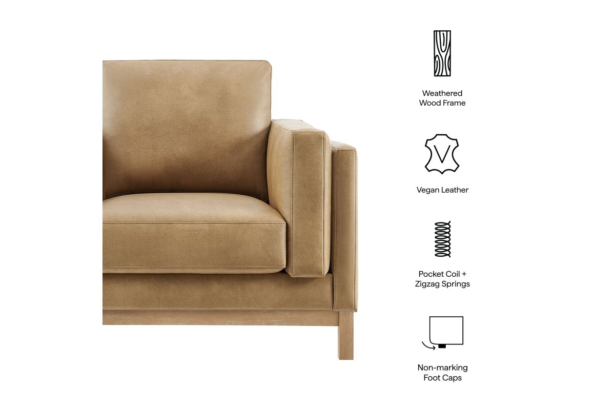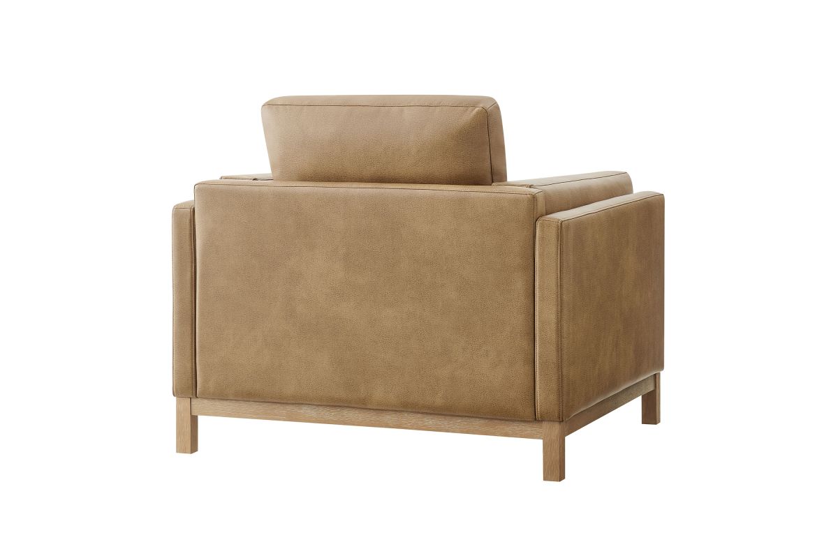 Refined lines and enduring design shape the Roscoe Armchair, a tailored take on American-traditional style. Upholstered in smooth vegan leather, this accent chair with arms features a deep, wide seat with plush back and seat cushions, made of high resiliency foam, further supported by spring pocket coils and sinuous springs for lasting comfort. The low, streamlined profile sits atop a kiln-dried weathered wood frame with integrated legs and non-marking foot caps for added stability and floor protection. A versatile faux leather accent chair for modern or classic interiors, Roscoe is great as a lounge chair for bedroom, corner reading chair, or living room leather chair. Weight Capacity: 800 lbs.
