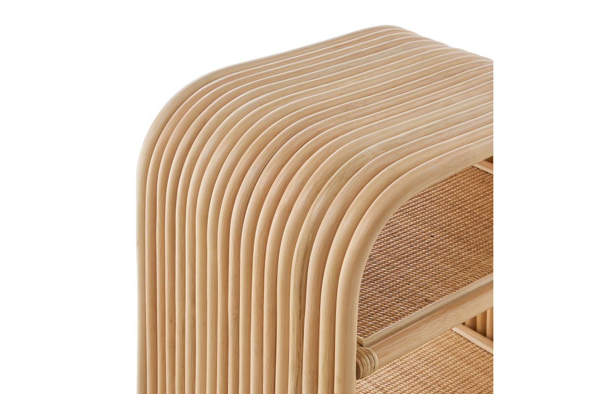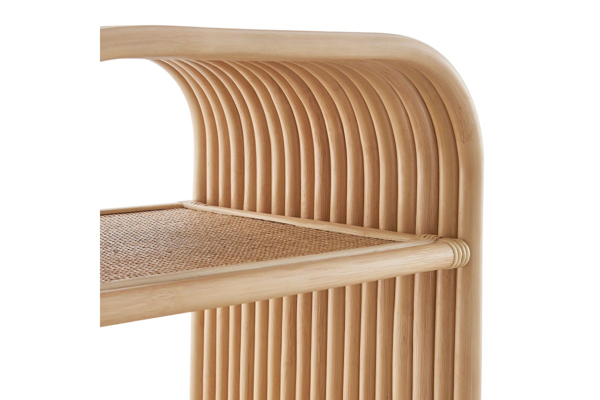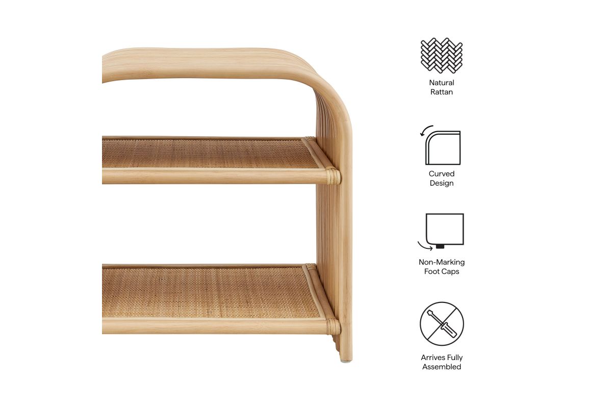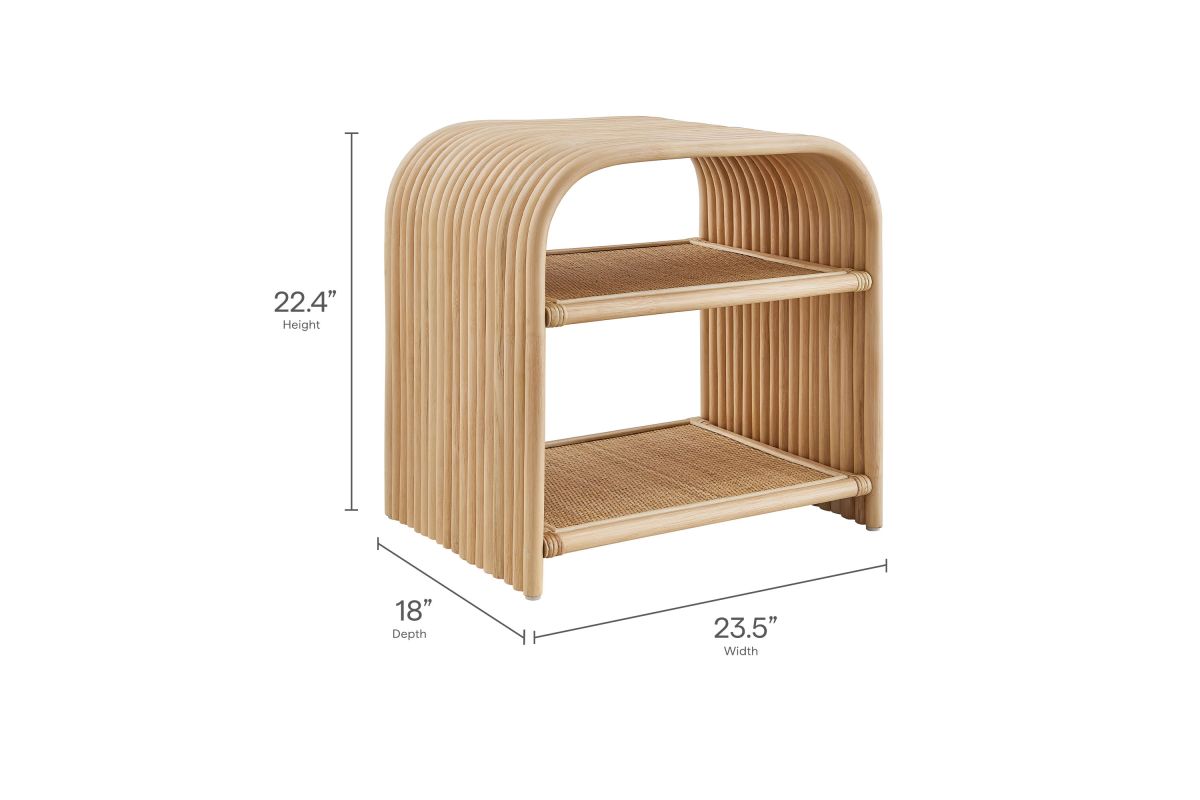 Bring a relaxed feel to your space with the Eve Natural Rattan Curved Side Table. Featuring a rounded profile and airy silhouette, this wide accent table or nightstand is crafted from natural woven rattan with curved lines for an organic, easygoing look. A fixed shelf offers room to stow books, candles, or small essentials, while non-marking foot caps help protect wood or tile floors. Perfect beside a reading chair, in a sunroom, or even on a covered patio, Eve arrives fully assembled and ready to add appeal and function wherever it’s placed. Product Note: Due to the natural qualities of rattan, slight variations in color and pattern are to be expected, adding to each piece’s unique character.