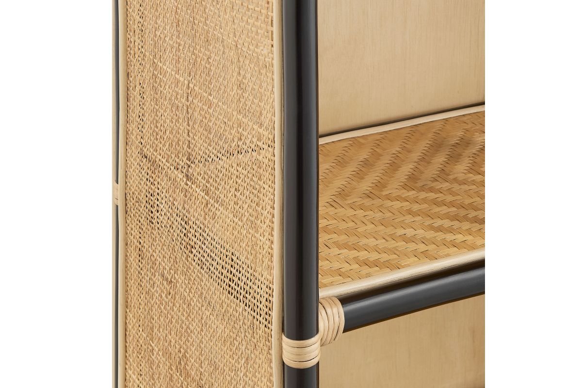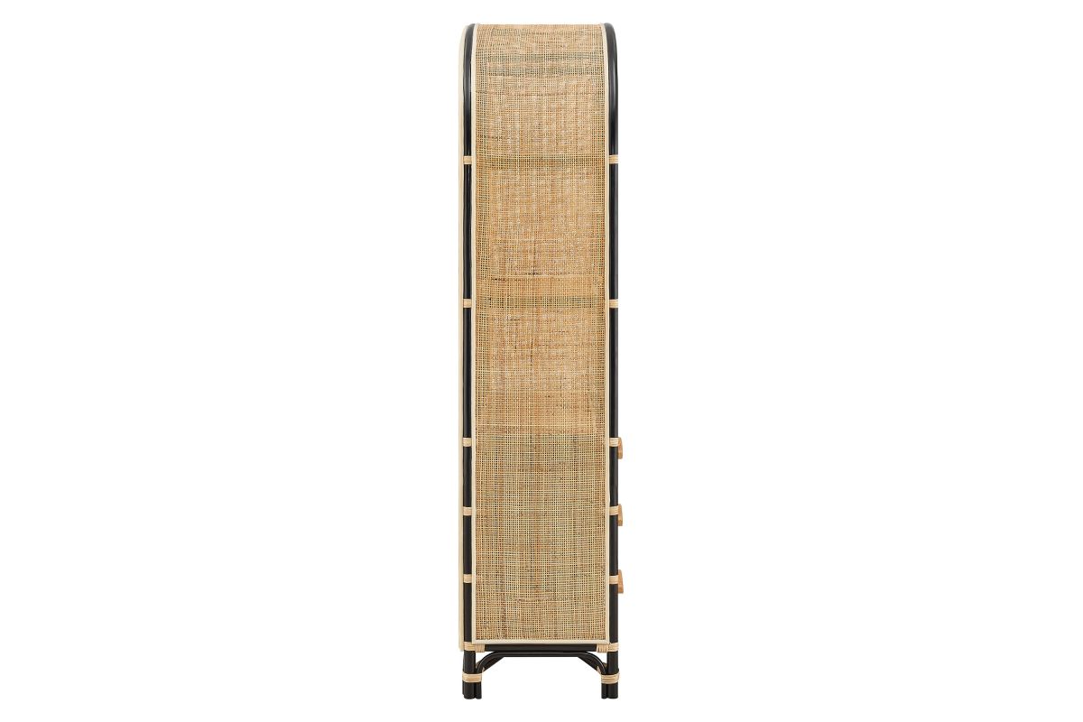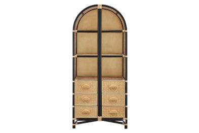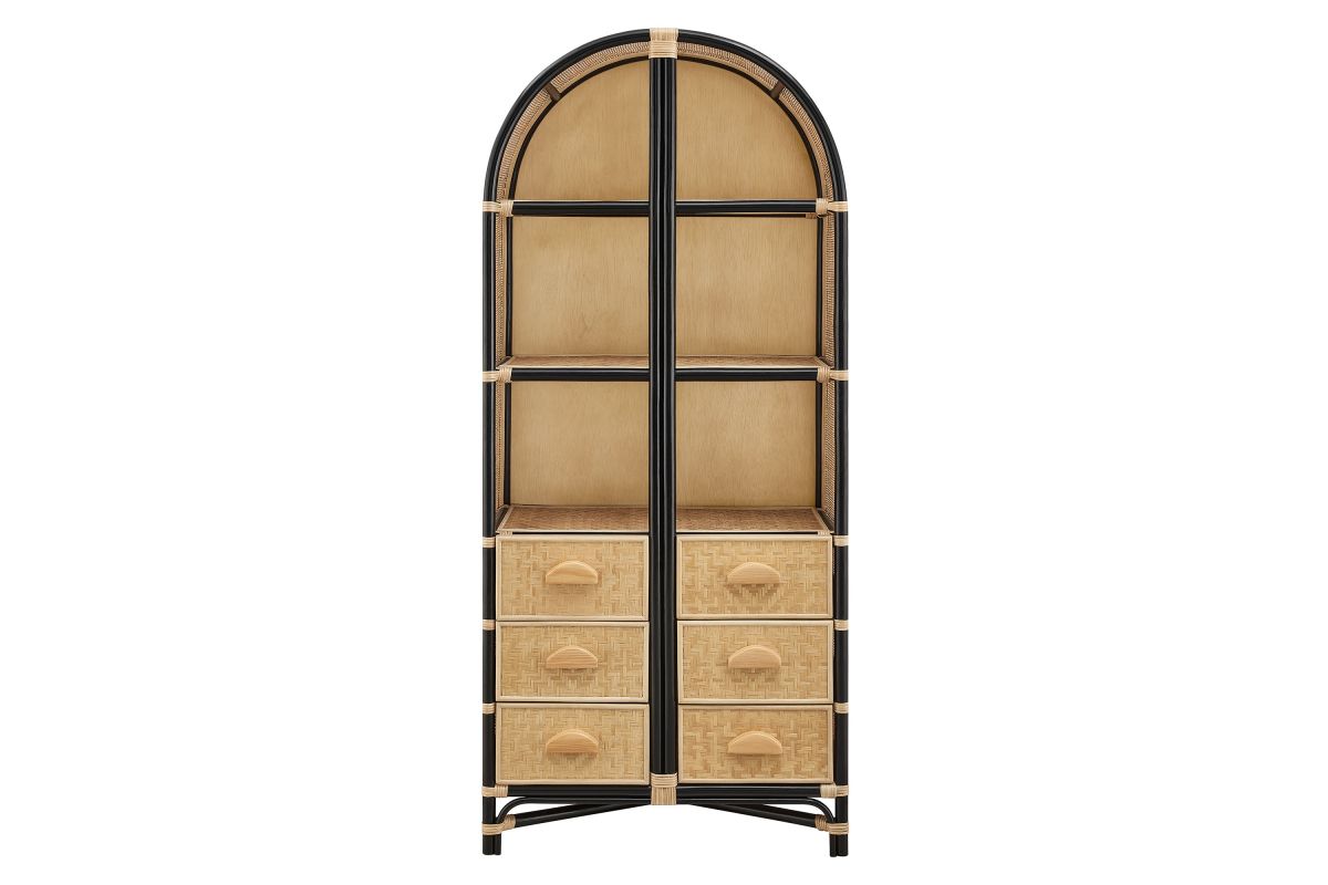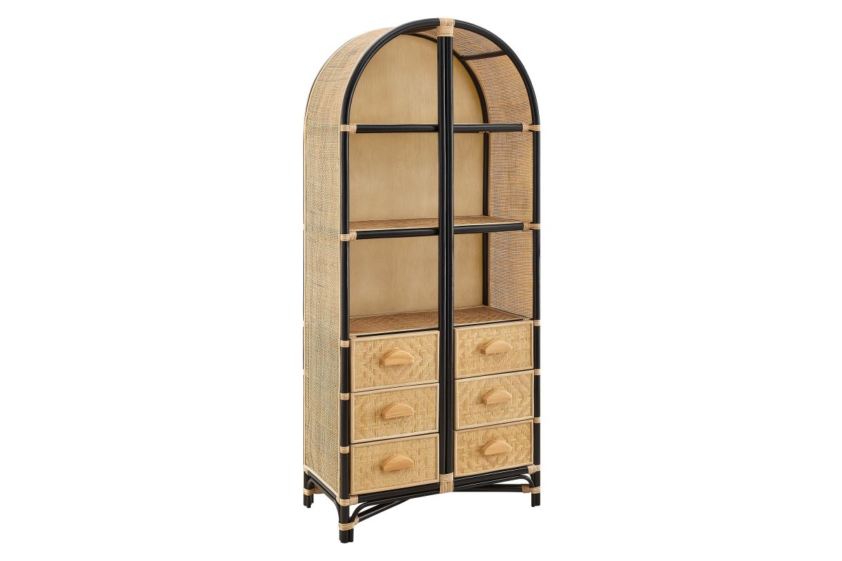 The 71" Jane arched bookcase offers a relaxed, artful take on everyday organization. Crafted from wood and natural rattan, this sculptural arched bookshelf features three open shelves—ideal for books, folded towels, or baskets—and six woven drawers below for stashing away smaller items. The gently curved frame and arched drawer pulls give it a soft, balanced look, while the sturdy X-cross base design adds unique character and support. Complete with non-marking foot caps, this bookshelf with storage arrives fully assembled and brings easy function and thoughtful style to any living room storage or bathroom space. Product Note: Due to the natural qualities of rattan, slight variations in color and pattern are to be expected, adding to each piece’s unique character.