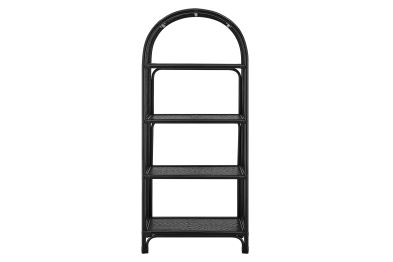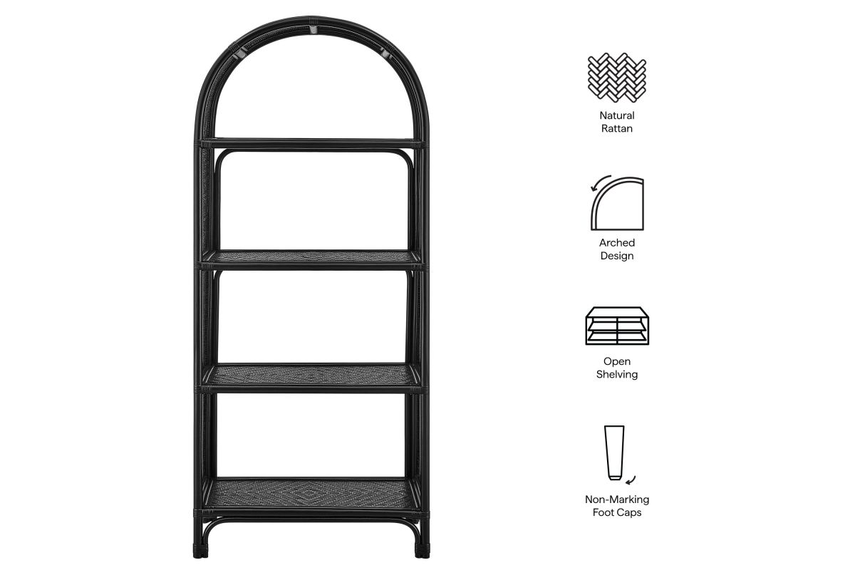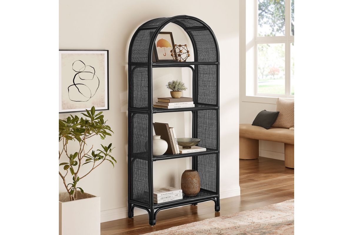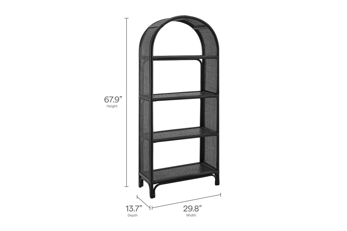 The 67" Celeste Arched Bookcase offers a relaxed, artful take on everyday organization. Crafted from wood and natural rattan, this open-back bookcase features four spacious shelves—perfect for books, towels, baskets, or decorative pieces—while its airy frame brings visual lightness to any room. The curved top and elevated legs lend a refined, architectural feel, and non-marking foot caps protect your floors. Fully assembled and ready to style, it’s a versatile addition to any living room or office. Product Note: Due to the natural qualities of rattan, slight variations in color and pattern are to be expected, adding to each piece’s unique character.