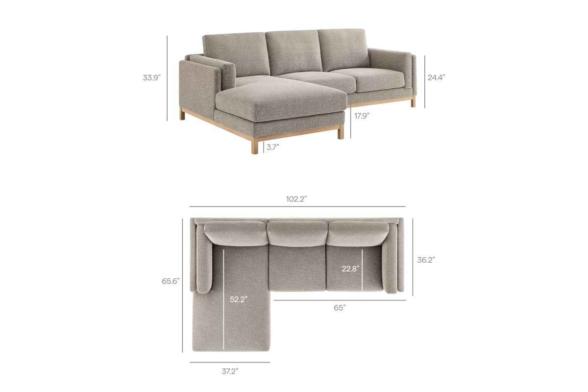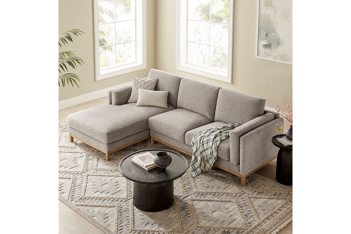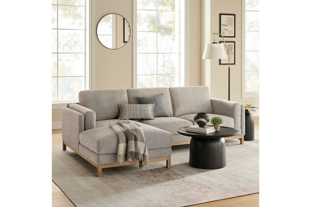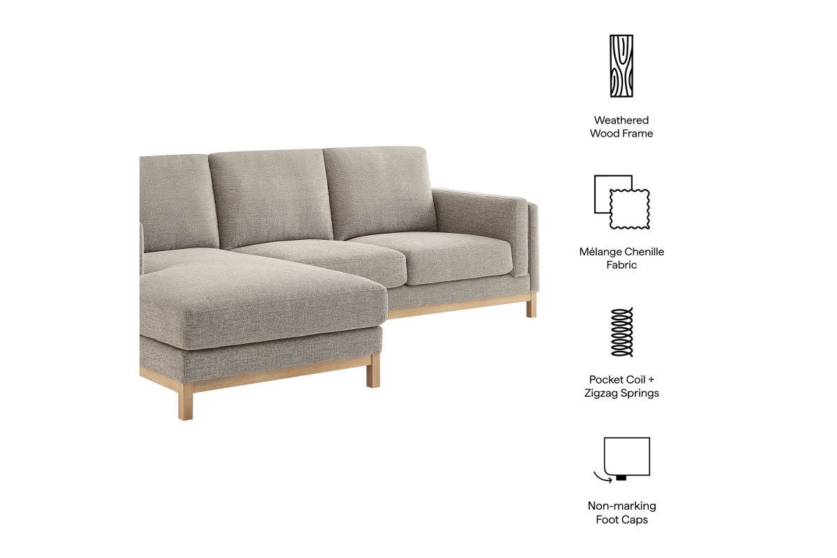 Refined lines and enduring design shape the Roscoe L-shaped Sectional Sofa with Chaise, a tailored take on American-traditional style. This two-piece configuration includes a left-facing chaise and a right-facing sofa, upholstered in soft and subtle Mélange Chenille for a smooth, heathered texture. Designed with plush seat cushions and spring pocket coil + sinuous spring support, this sectional couch offers deep, sink-in comfort with a grounded silhouette. Featuring high resiliency foam, the low-profile frame sits on a kiln-dried weathered wood base with integrated legs and non-marking foot caps for added stability and floor protection. Weight Capacity: 800 lbs per piece.