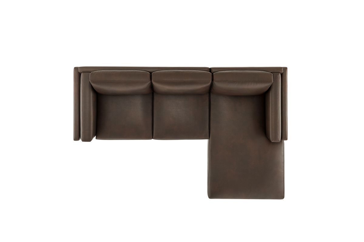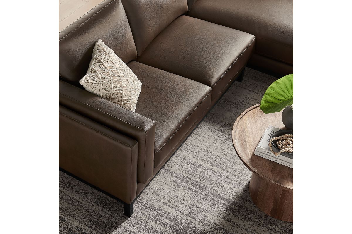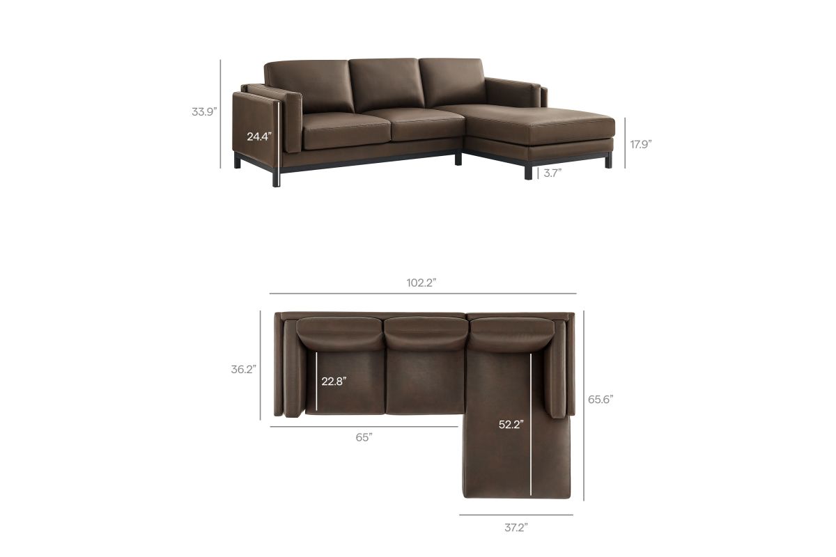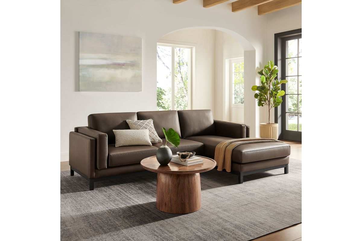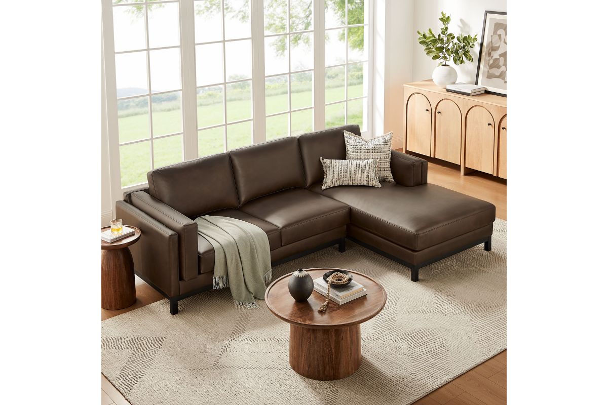 Refined lines and enduring design shape the Roscoe L-shaped Sectional Sofa with Chaise, a tailored take on American-traditional style. This two-piece configuration includes a right-facing chaise and a left-facing sofa, upholstered in smooth vegan leather with a subtle grain and soft, refined finish. Designed with plush seat cushions and spring pocket coil + sinuous spring support, this sectional couch offers deep, sink-in comfort with a grounded silhouette. Featuring high resiliency foam, the low-profile frame sits on a kiln-dried weathered wood base with integrated legs and non-marking foot caps for added stability and floor protection. Weight Capacity: 800 lbs per piece.