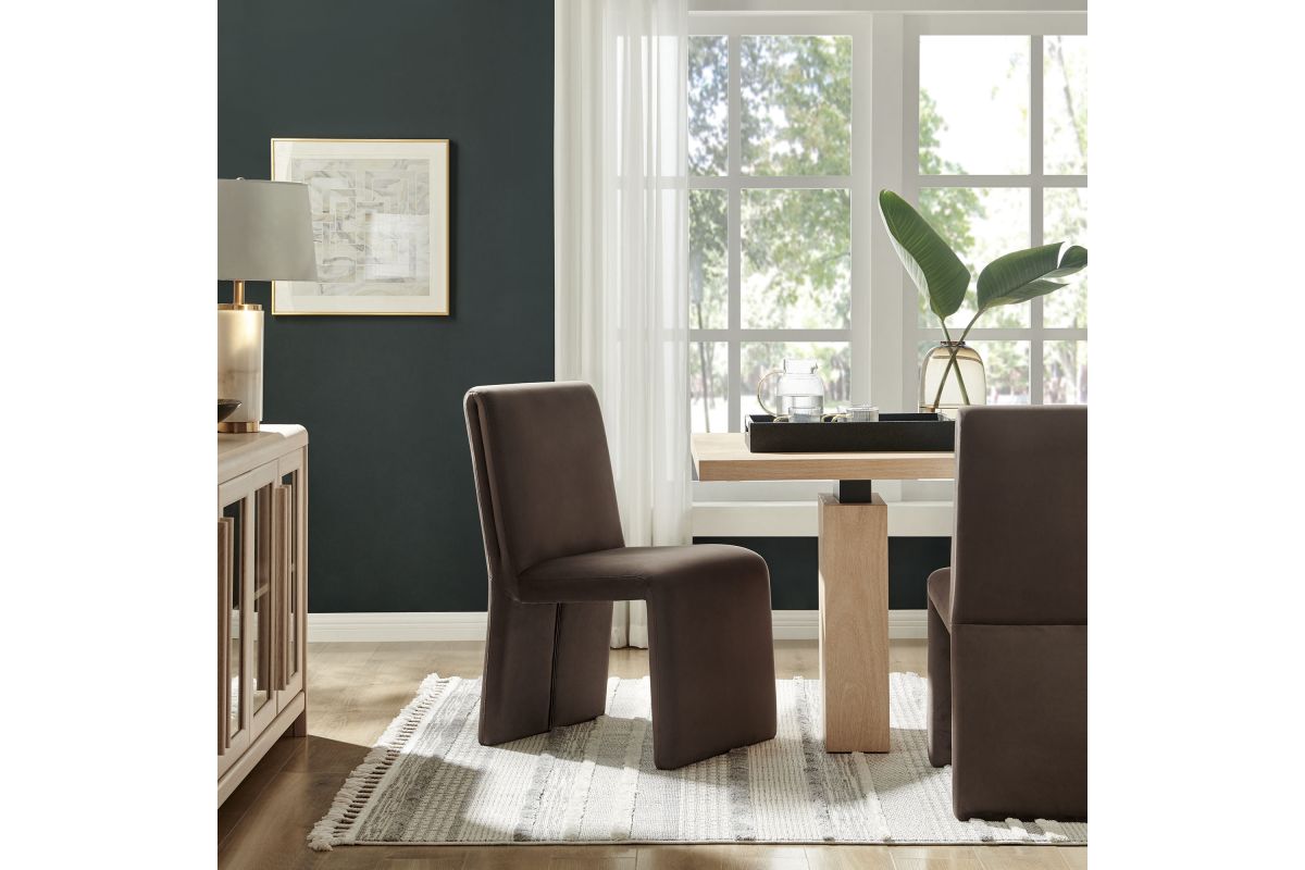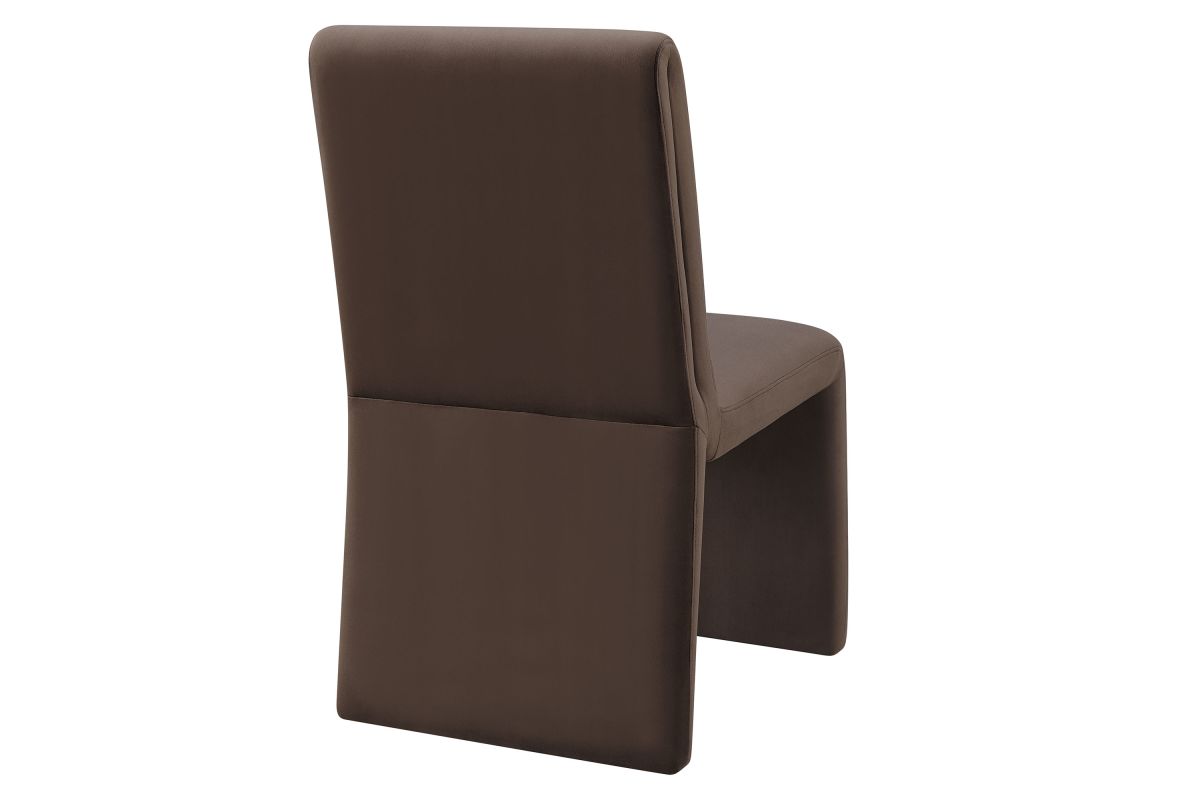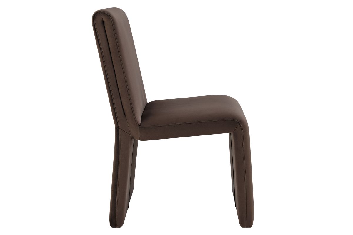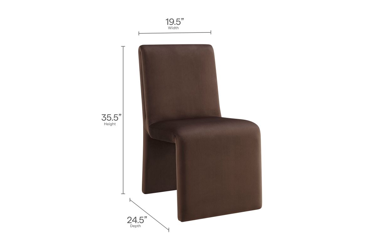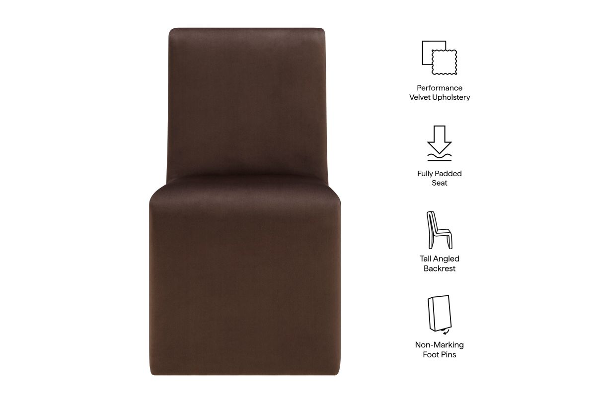 With its smooth curves and continuous form, the Emory Armless Dining Chair brings an elegant, contemporary feel to any space. Wrapped entirely in soft performance velvet fabric, this single slipper dining chair features a tall, gently angled backrest that provides support while maintaining a clean, minimal profile. The padded seat flows into the base with a waterfall edge that adds both comfort and balance. Its armless shape and crisp lines make it easy to style around a dining table or as a padded bedroom chair, or living room accent chair. Built with a sturdy internal wooden frame and finished with non-marking foot pins, Emory arrives fully assembled and supports up to 300 lbs.