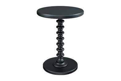 The Black Round Spindle Table features a bright, smooth finish and a trendy, stack designed base. Its round edges and classic style will add charm to any space. Sized perfectly to sit next to your favorite chair or bedside, the table provides enough space for a lamp or to accommodate household items. Some assembly required.
