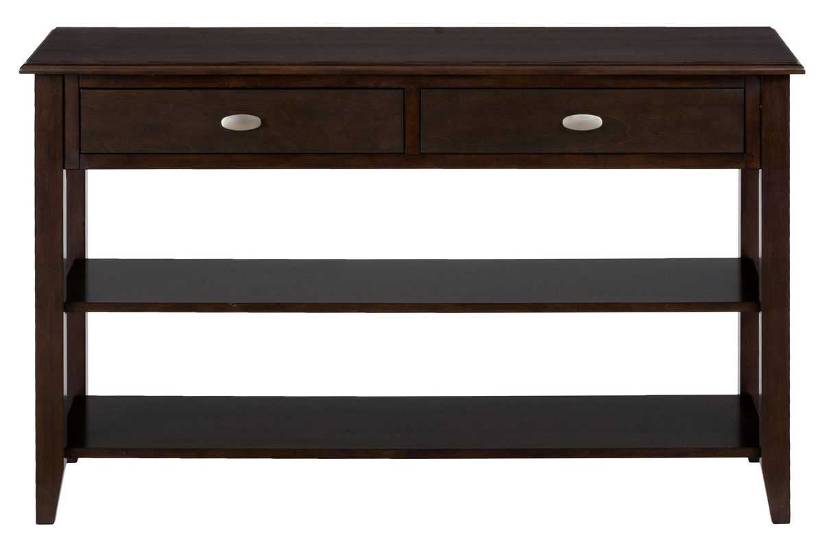 This sofa table will help you to create a feeling of relaxed style inside your living room. It is designed to be stylish and roomy. It accomplishes its task with a rich, merlot finish over birch veneers. English dovetails add quality to the piece while keeping it affordable and brushed nickle knobs add accent to the drawers. Storage includes two shallow drawers and two open shelves.